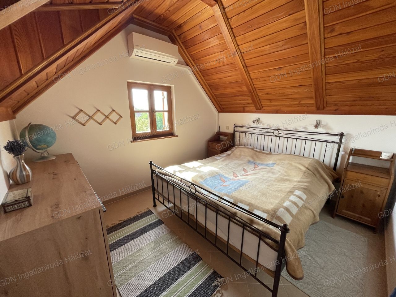 Panorámás szőlőhegyi ház Balatonfüreden – borospince, terasz, nagy telek! Balatonfüred csendes szőlőhegyi részén, 1868 m²-es telken eladó egy bruttó 158 m²-es kitűnő állapotú, igényes, Tihanyra néző panorámás ház téglaboltozatos borospincével, tágas terasszal, modern gépészettel és gondozott szőlővel. Az ingatlan Balaton-felvidék hagyományos stílusát és a kortárs építészet kifinomultságát ötvözi. Természetes, nemes anyagokból, helyi mesterek munkájával készült, így minden részlete a minőséget és tartósságot tükrözi. A ház a Balatonra nyíló panorámával és a természet nyugalmával ajándékoz meg, miközben Balatonfüred pezsgő élete néhány perc alatt elérhető. Főbb adatok Helyszín: Balatonfüred, szőlő besorolású telek Telek mérete: 1868 m² (gondozott szőlővel, díszkerttel, csúszdás mászókával, tágas parkolóval) Épület bruttó alapterülete: 158 m² Pince + földszint + tetőtér + borospince padlófűtés, extra radiátorok, sütőfunkciós cserépkályha, napkollektor – energiatakarékos kivitel Panorámás elhelyezkedés, természetvédelmi övezet mellett Az épület L-alakú, több szinten kialakított ház, tető- és homlokzatszigeteléssel, kettős hódfarkú betoncseréppel fedve Teljes alápincézés: tárolóhelyiség, infraszaunás, padlófűtéses fürdőhelyiség, gépészeti helyiség Borospince: földdel fedett téglaboltozatos, külön szellőzőkkel, tölgyfa ajtókkal, felülvilágítással Földszint: nappali + étkező (19,8 m²) + konyha (7,2 m² ) légtérben split klímával, vendégszoba (8,9 m²) + zuhanyzós fürdő (2,4 m²) Emelet: 2 hálószoba (20 és 10,2 m²) split klímákkal, sarokkádas fürdő (4,1 m²), külön WC (1,6 m²), tároló Kiegészítők: cserépkályha, infraszauna, félköríves terasz (25 m²), melynek burkolata felújításra szorul, így lehetőséget biztosítva a további egyéni igények kialakítására. Felszereltség és extrák Viessmann gépészet: a tetőn elhelyezett napcellákkal a 705 l szünetmentes tápegységgel kiegészített puffertároló egész nyáron melegvizet, télen fűtésrásegítés funkciót biztosít. Fűtés: a föld alatti 5 m3-es propángáz tartály biztosítja a padlófűtést minden szinten, a nappaliban cserépkályha sütőfunkcióval, split klímák, a fürdőkben plusz törölközőszárító radiátorok. Nyílászárók: spalettás hőszigetelt tölgyfaablakok, mozgás-nyitásérzékelő riasztórendszerrel, kamerákkal. Szennyvíz: földalatti zárt szippantós. Kapcsolatok: meglévő UPC tányér és bevezetett telefonkábel, WIFI Extra: cserépkályha és infraszauna. Kert és telek Térkövezett parkoló, akár 5-6 autó részére 1868 m² telek, melynek 80%-a gondozott szőlő (rizling, muskotály, csemegeszőlők) Vadkerítés, elektromos úszókapu, nagy parkoló világítással Csepegtetőrendszer a díszkerthez, a szőlőben mozgásérzékelő reflektorok Játszótér: fa mászóka, csúszda, dupla hinta Kerti tároló. Állapot Újszerű, megkímélt állapot Folyamatosan karbantartva Ez az ingatlan tökéletes választás mindazoknak, akik Balatonfüreden keresnek nyugodt, panorámás környezetben épült, hivatalosan és szabályosan megépített gazdasági épületet, pince- és borospince-kapcsolattal, teljes infrastruktúrával, energiatakarékos gépészettel.
