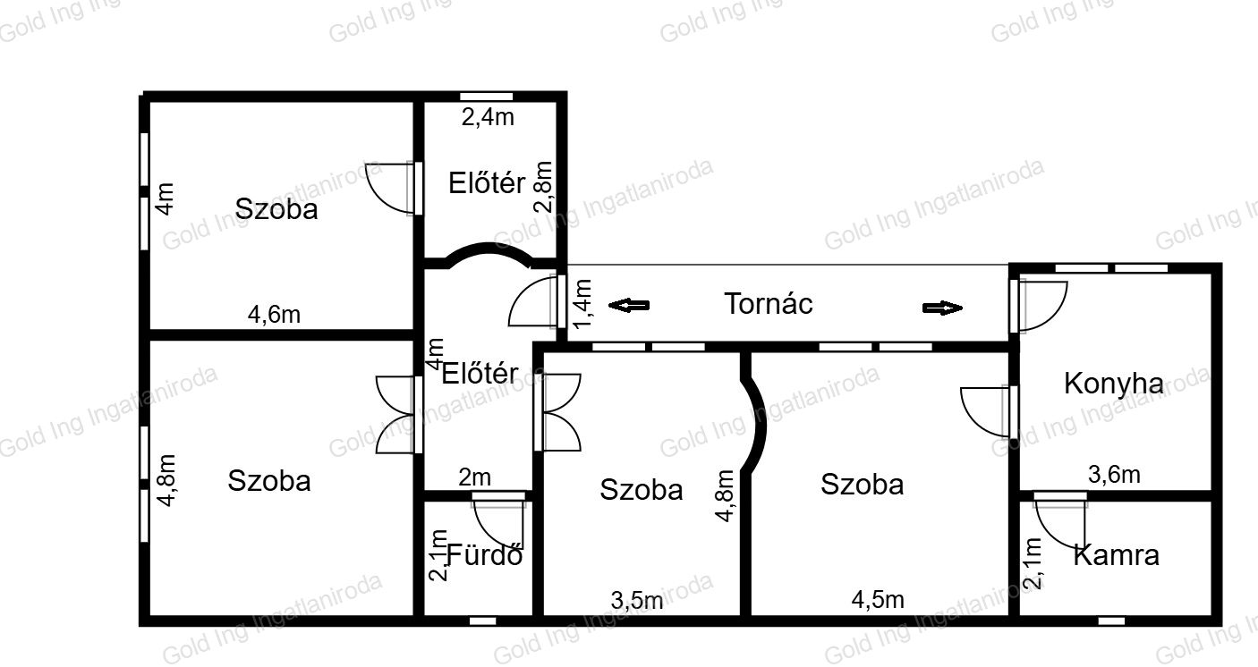 Ez a tágas otthon 4 szobával (22, 22, 18, 17 nm-es), egy konyhával és egy kamrával, valamint egy fürdőszobával rendelkezik. Az első és a hátsó bejárat is egy szélvédett, fedett tornácról nyílik. A két hátsó szoba boltívvel kapcsolódik egymáshoz, az egyiknek az előtérből, a másiknak a konyhából van külön bejárata. Ilyen boltívvel találkozunk, a főbejárat utáni előszobánál, és előtérnél is. Ezeket az összenyitott tereket, szükség esetén könnyen, akár gipszkartonnal le lehet zárni. Fordítva, az egybenyitásuk lenne nagyobb költség, mert az falbontással jár.