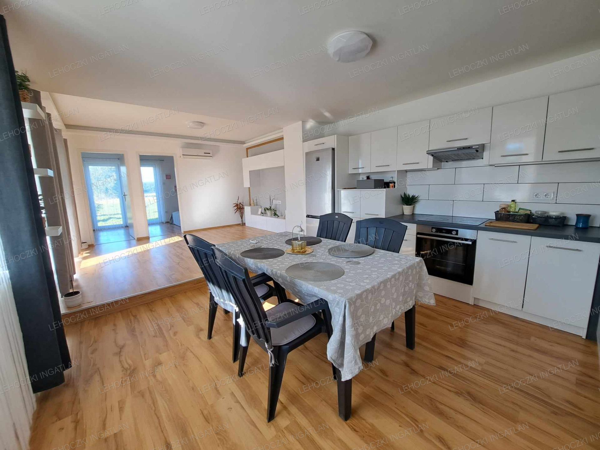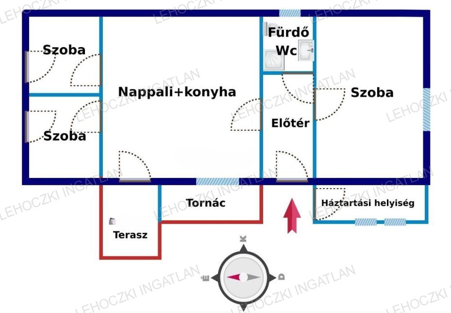 - helységei: előtér, nappali-amerikai konyha, 3 különnyíló szoba, Fürdő, Wc egy helyiségben, háztartási helyiség, FEDETT terasz,
