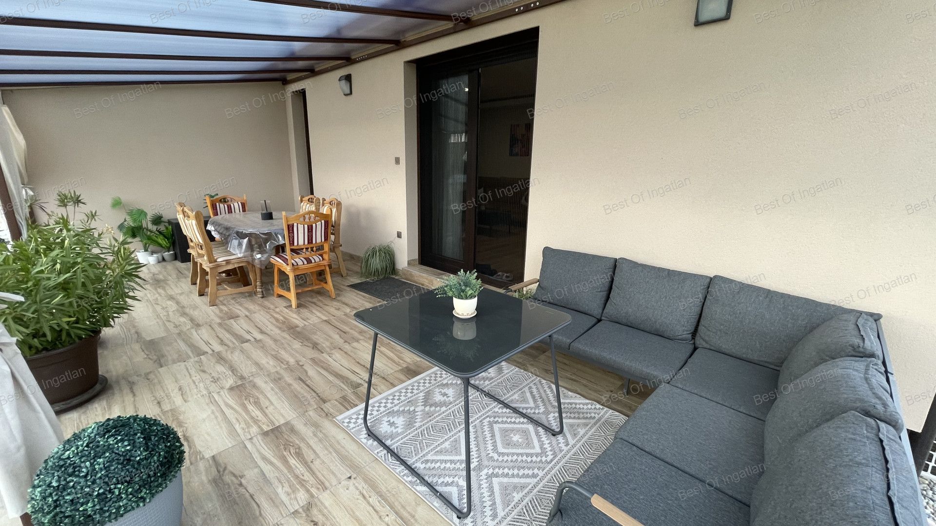27 m2-es, polikarbonát tetős, fedett, kerámiaburkolatos terasz alkalmas helyszín lehet baráti vagy családi összejövetelekre.