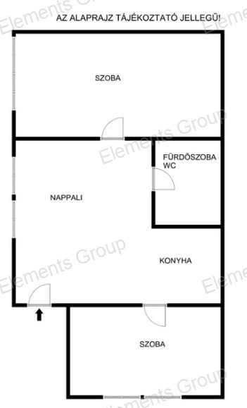 Elosztása: 2 nagy szoba, nappali–konyha, valamint fürdőszoba és WC.