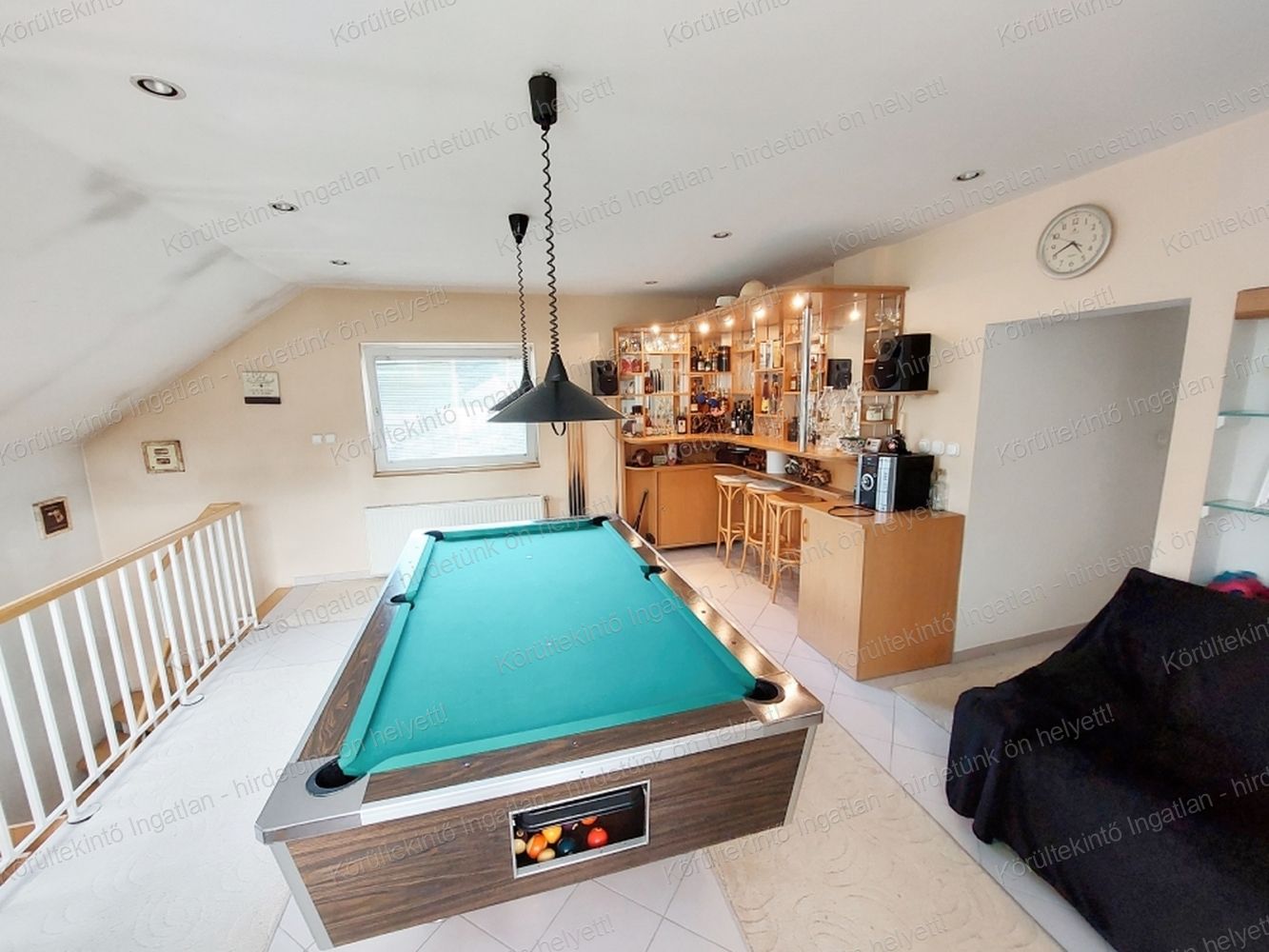A klimatizált ház földszintjén kapott helyet az amerikai konyhás nappali, továbbá egy zuhanyzós fürdő. Az emeleten újabb nappali található biliárd asztallal, valamint két háló és egy kádas fürdő. A tetőtérben kapott helyet a wellness részleg, itt egy nagy szobában kondigép, szolárium, valamint szauna és zuhanyzó található.
