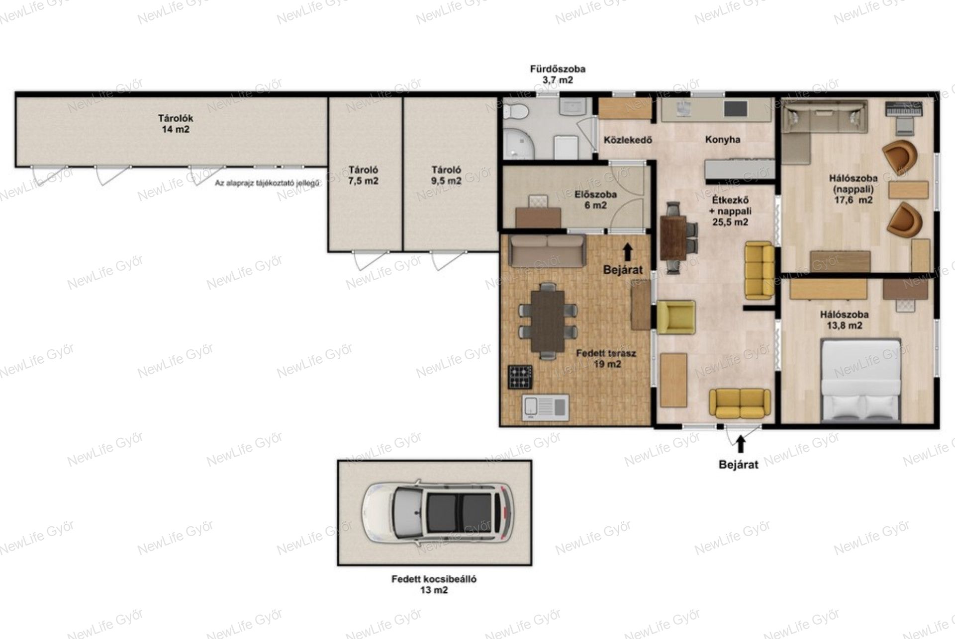 Elosztása: két nagy szoba (egyik akár nappaliként is funkcionálhat), konyha étkező és nappali egyben, fürdőszoba zuhanyzóval, WC-vel és egy nagy előszoba, ami akár dolgozószobaként is használható. A fedett terasz pedig akár egy nyári nappaliként is használható, ahol főzési lehetőség is kialakításra került.