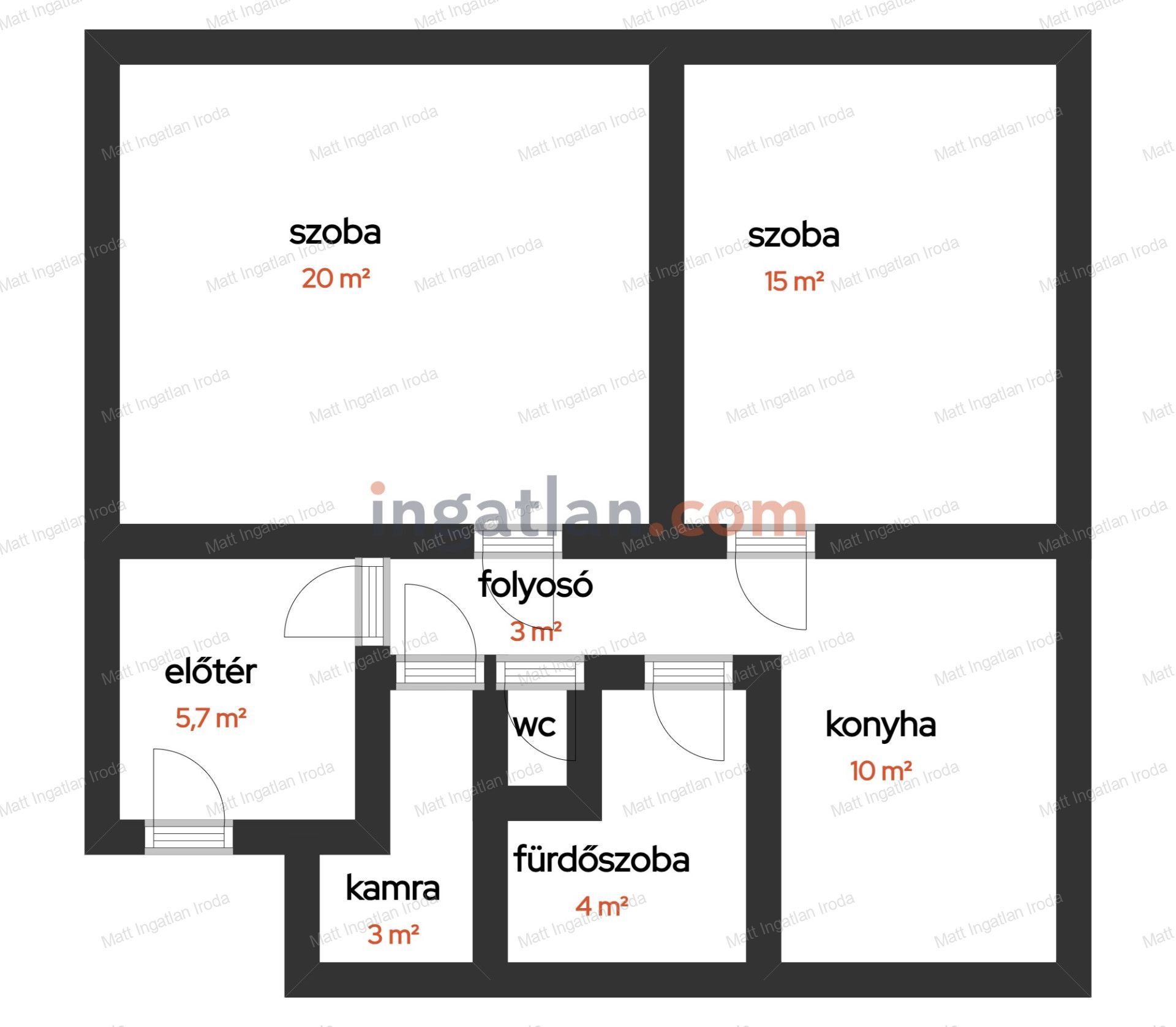 Elrendezése: 2 szoba, konyha, fürdőszoba, külön WC, kamra – jól kihasználható, praktikus elosztással.
