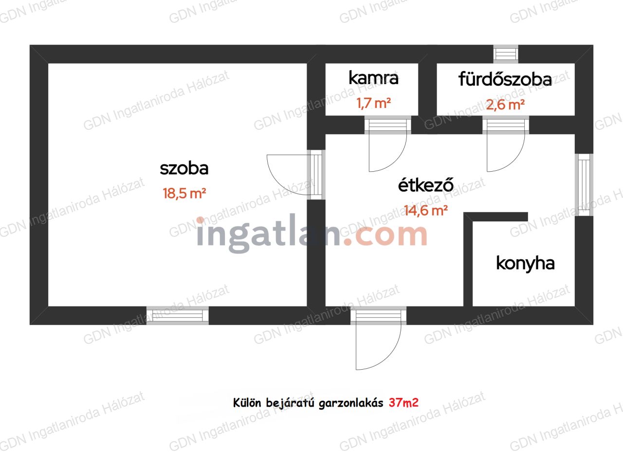 szoba 18,5m2, konyha-étkező-előtér 14,6m2, fürdőszoba 2,65m2, kamra 1,7m2;