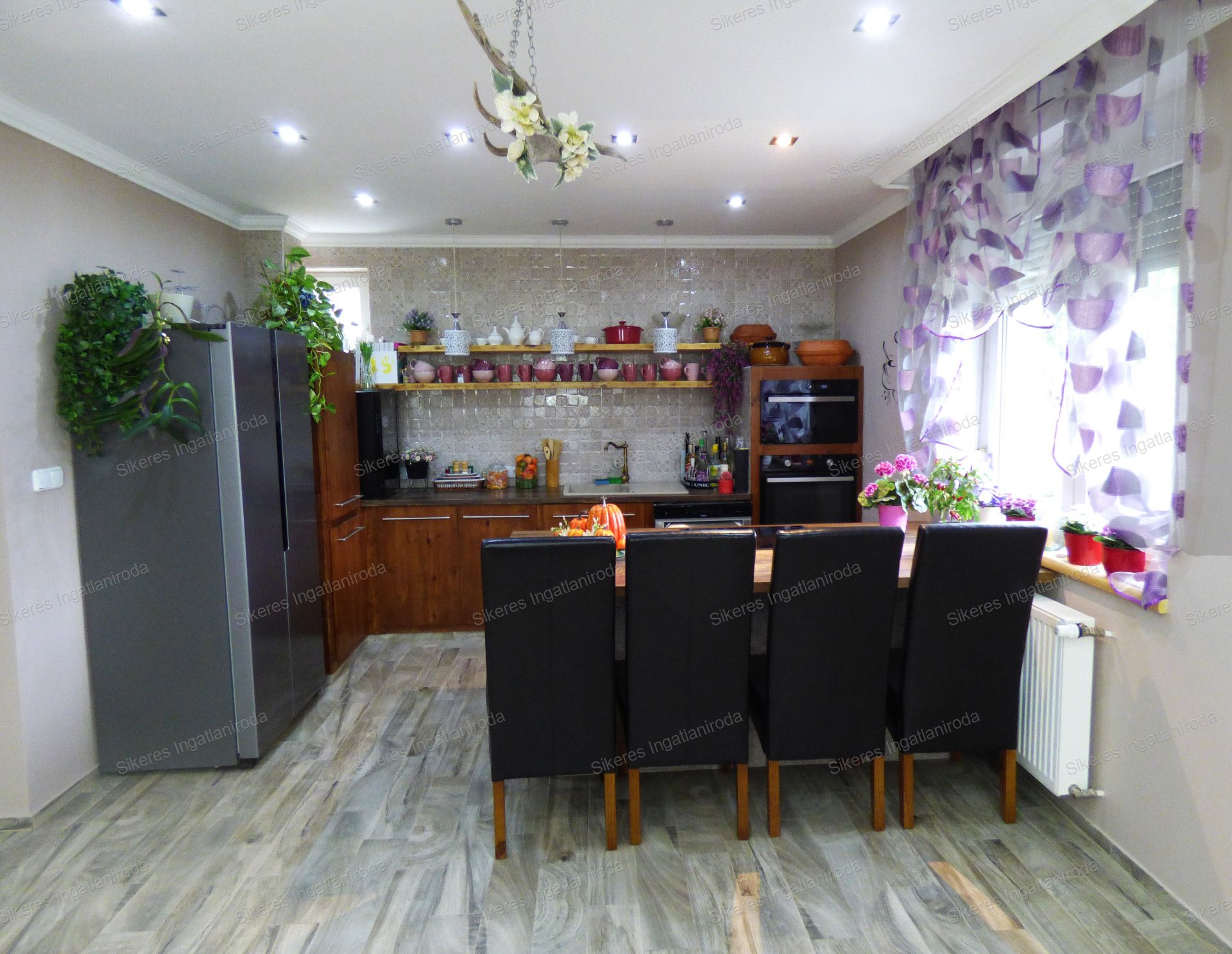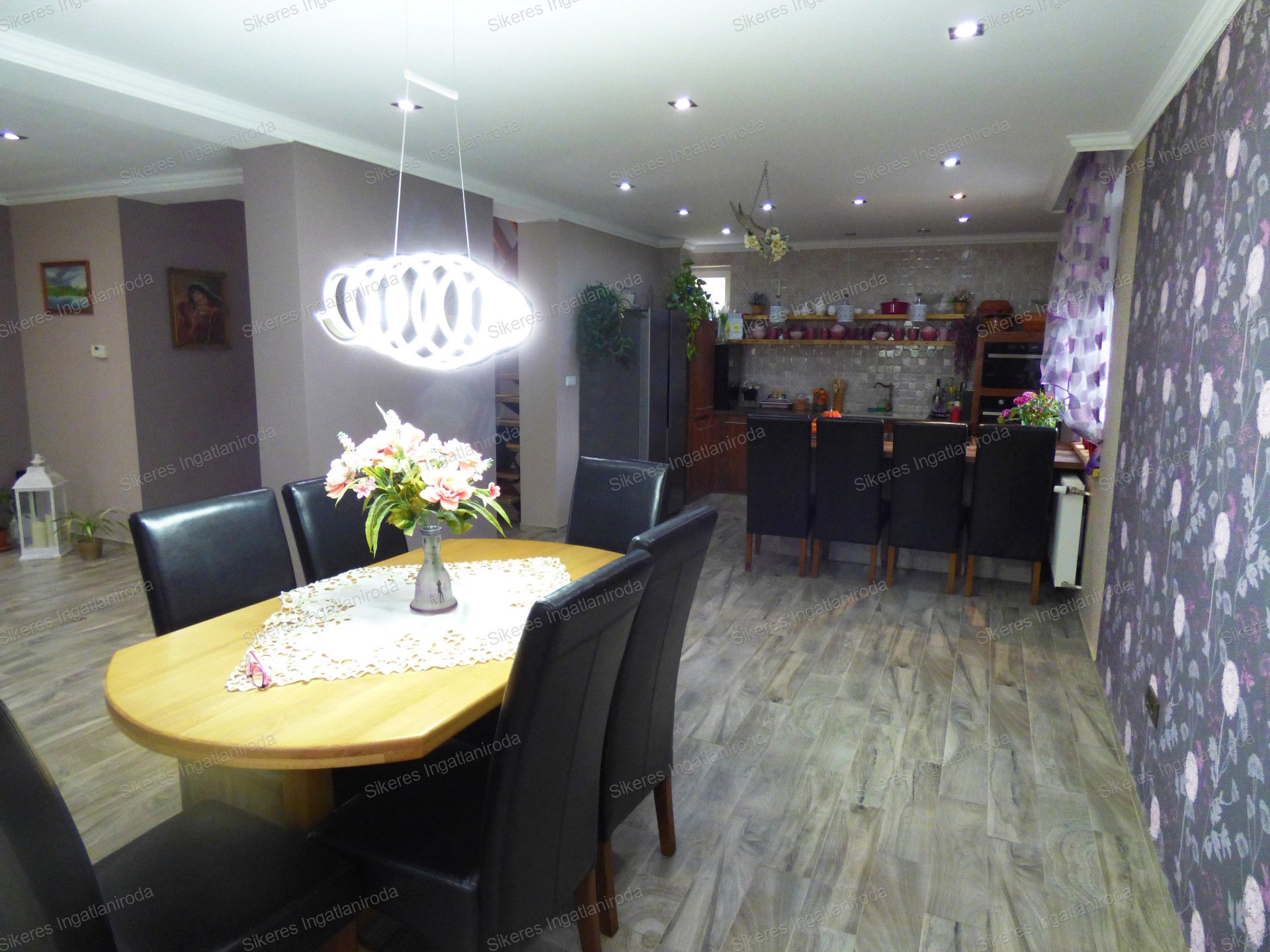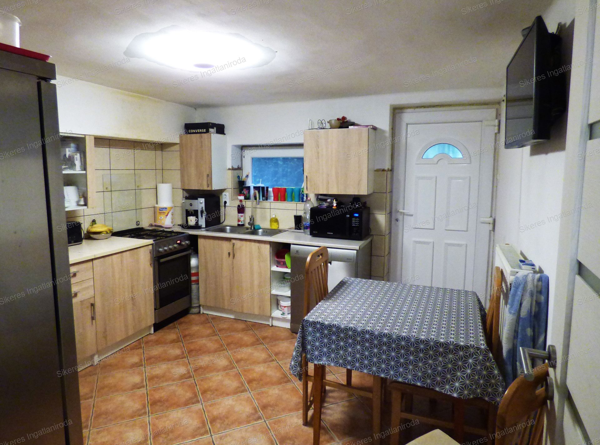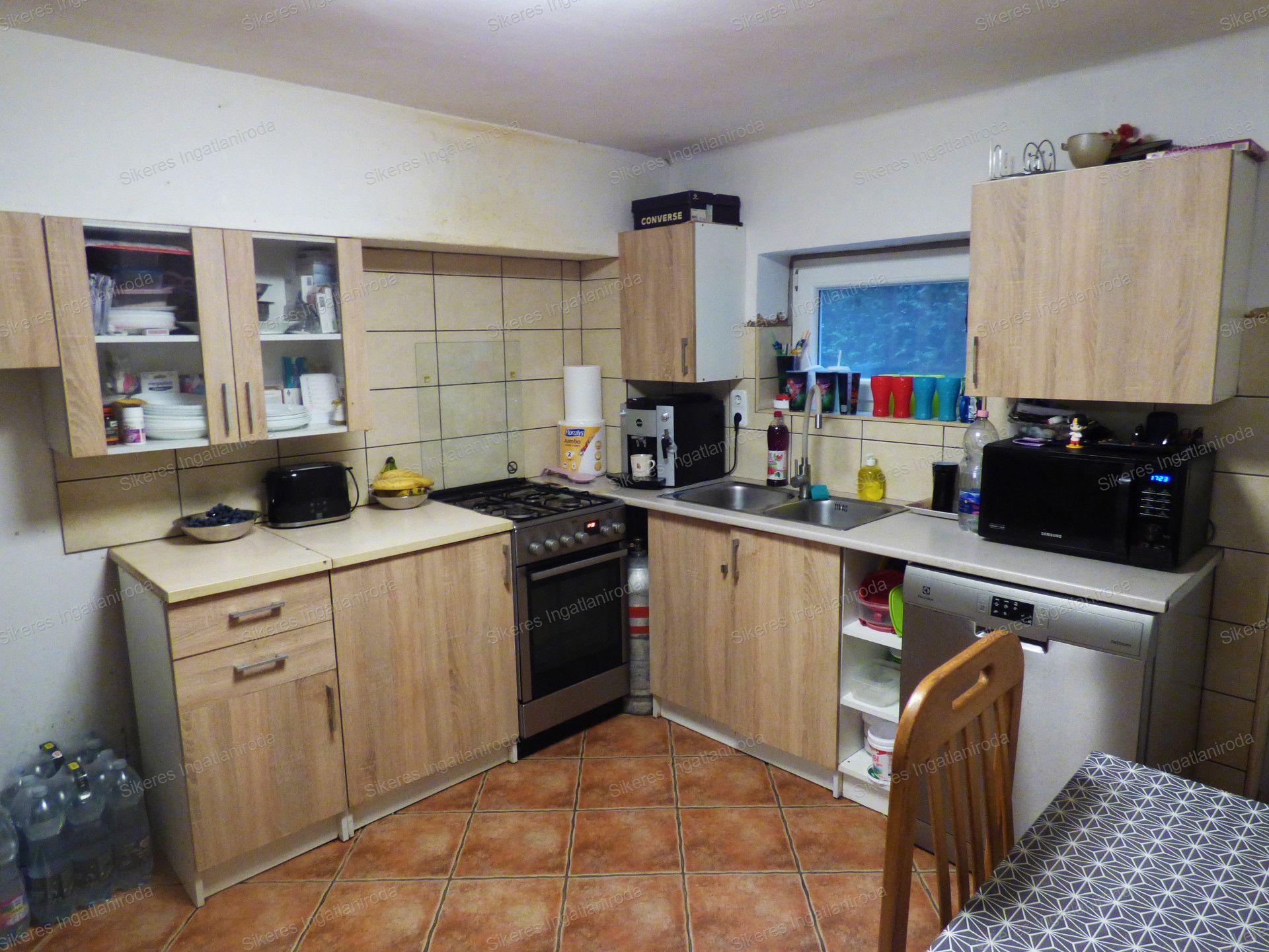 A beépített konyhabútor háztartási gépekkel felszerelt, indukciólapos főzőlap, sütő, beépített mikrohullámú sütő, mosogatógép, ami a földszinten elhelyezkedő konyhában is van, mind a berendezés részét képezi.