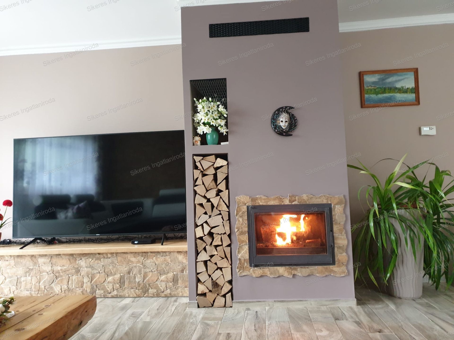 A nappaliban kandalló is beépítésre került, ami még hangulatosabbá, melegebbé teszi az otthont.
