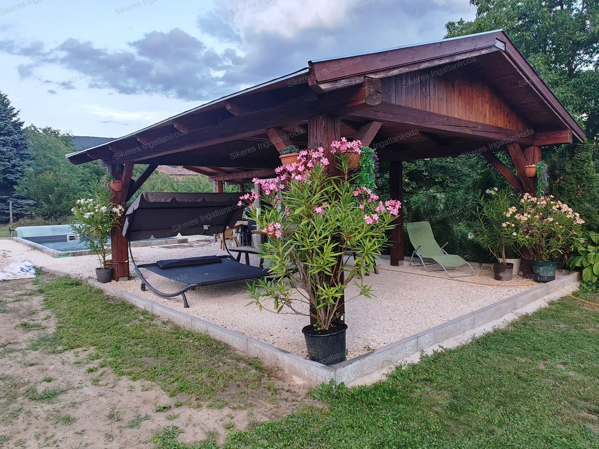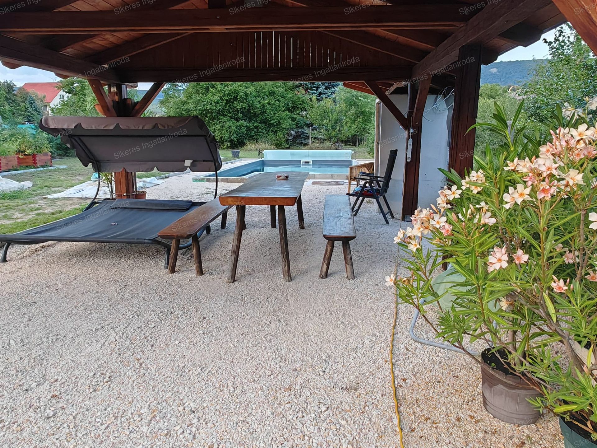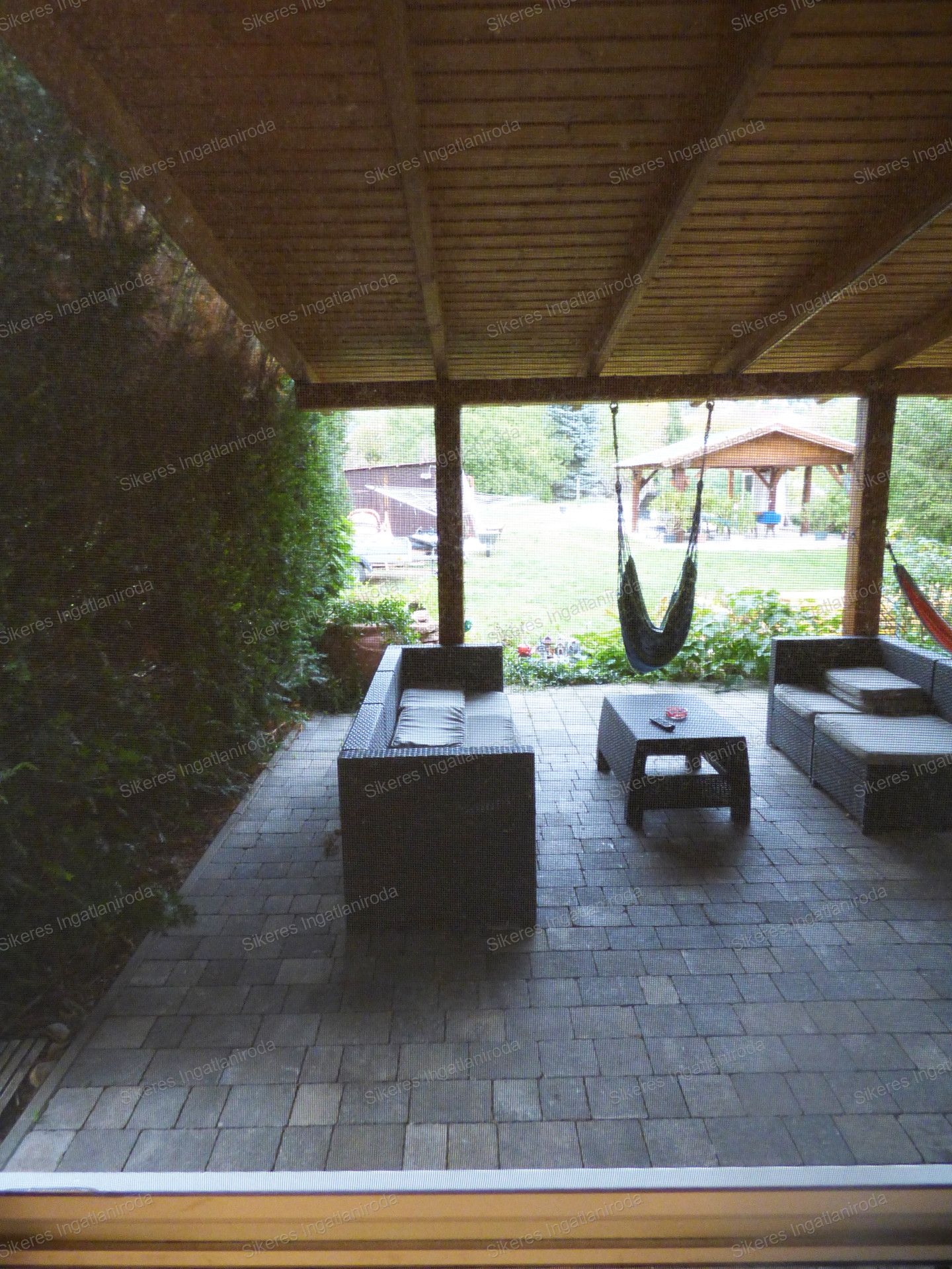 A hátsó kert 2 fedett terasszal rendelkezik valamint itt található egy kerti grillező is az épített medence mellett, ahol a nyári melegben minden nap kedvünkre élvezhetjük a fürdőzést. A medencében a víz mélysége 140 cm, hossza 6 m, szélessége 4m.