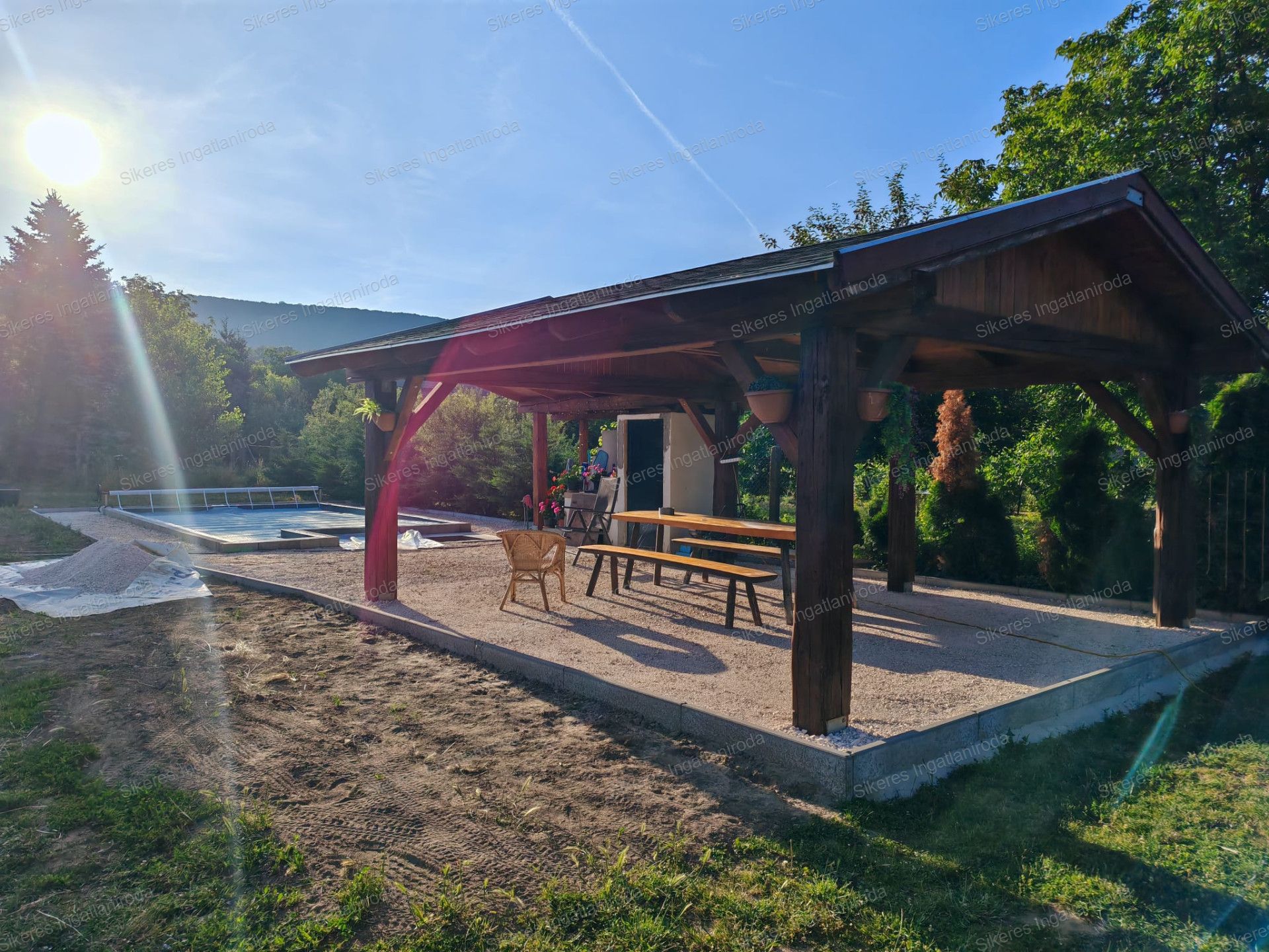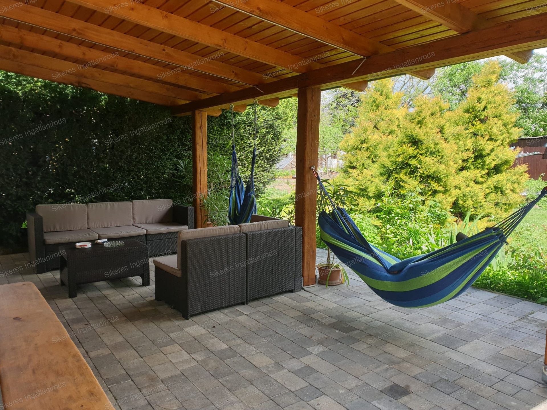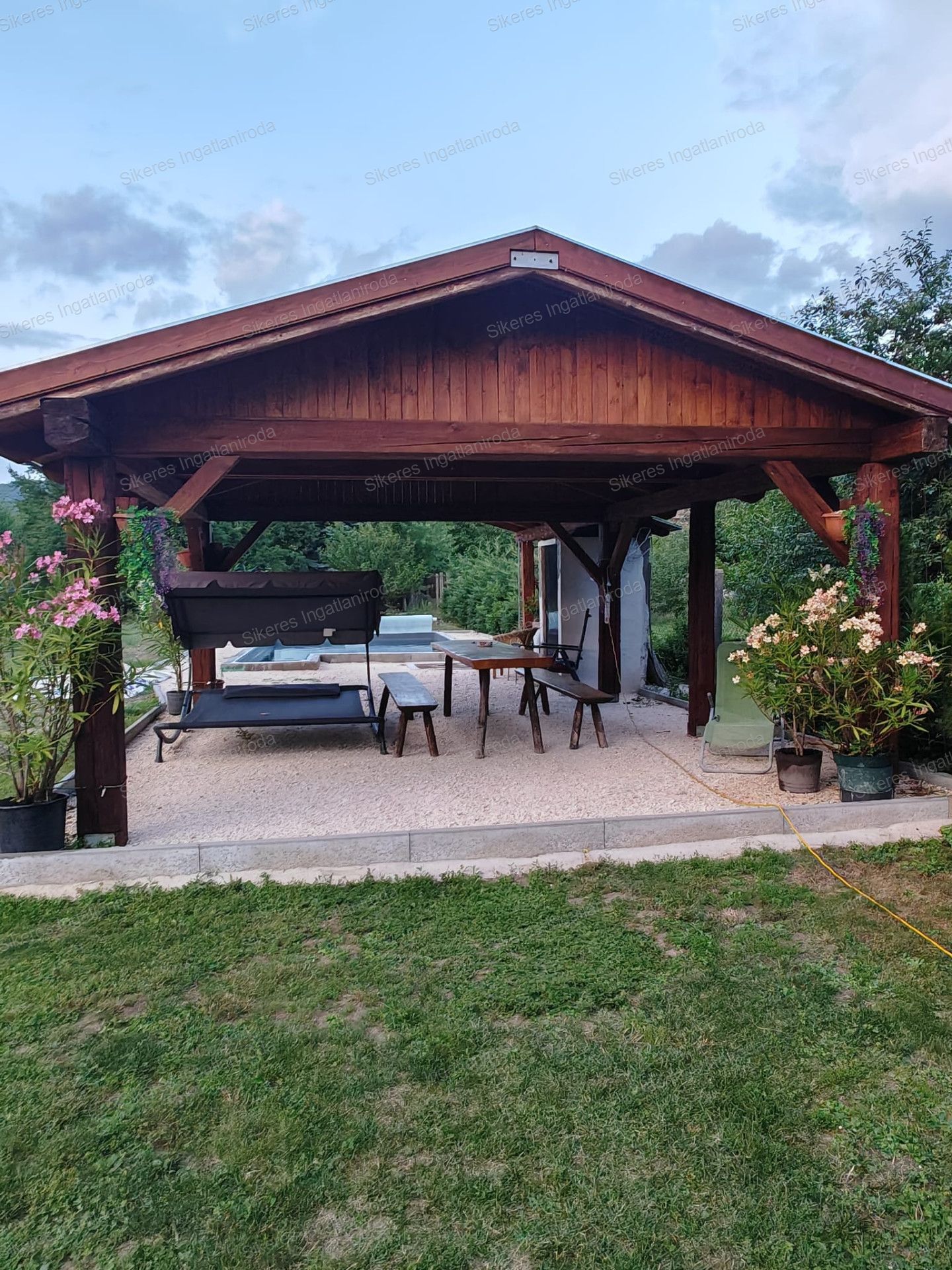 A hátsó kert 2 fedett terasszal rendelkezik valamint itt található egy kerti grillező is az épített medence mellett, ahol a nyári melegben minden nap kedvünkre élvezhetjük a fürdőzést. A medencében a víz mélysége 140 cm, hossza 6 m, szélessége 4m.