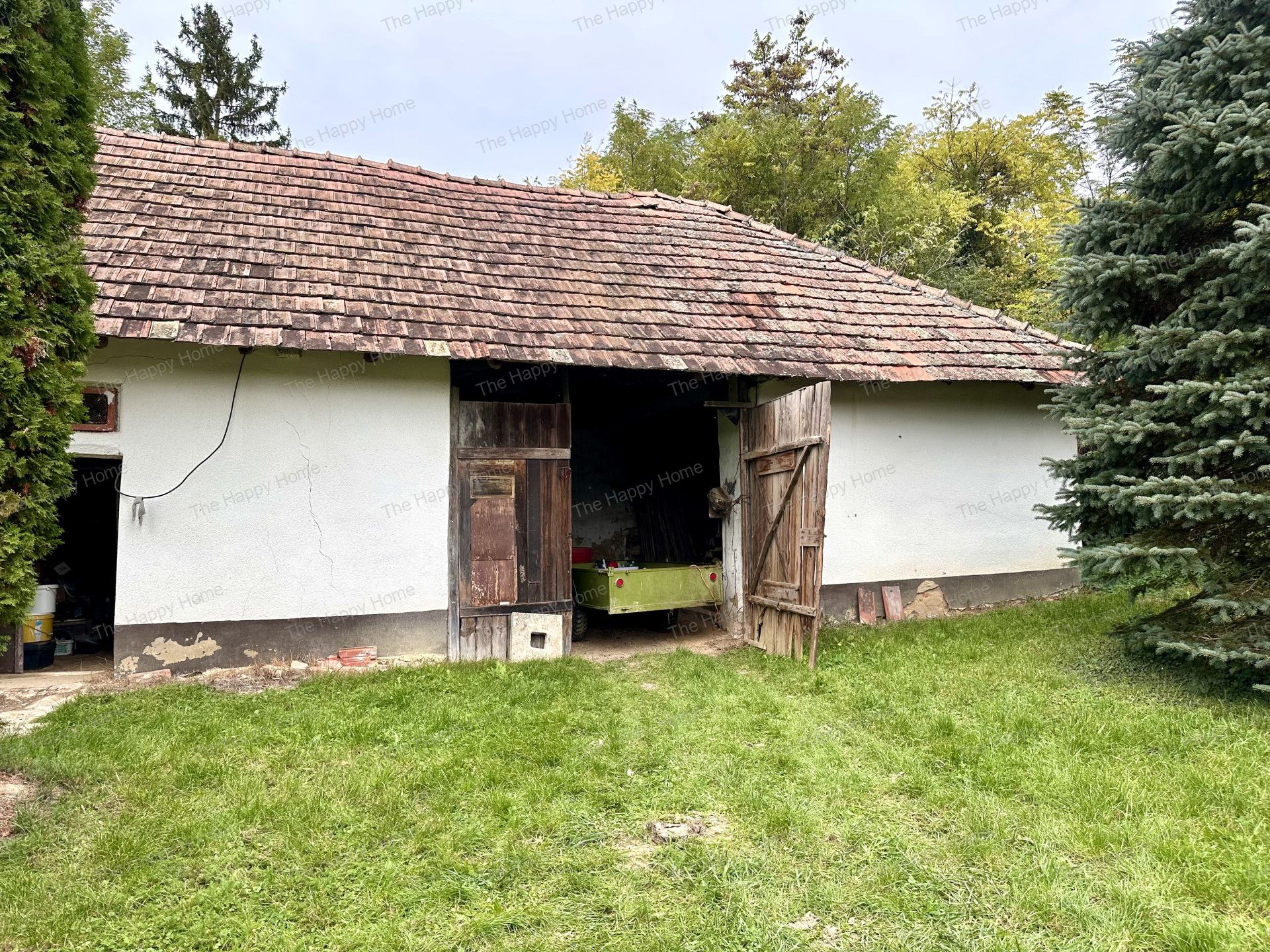 A régi pajta garázzsá vagy műhellyé alakítható — és nagyban hozzájárul az udvar bensőséges hangulatához.