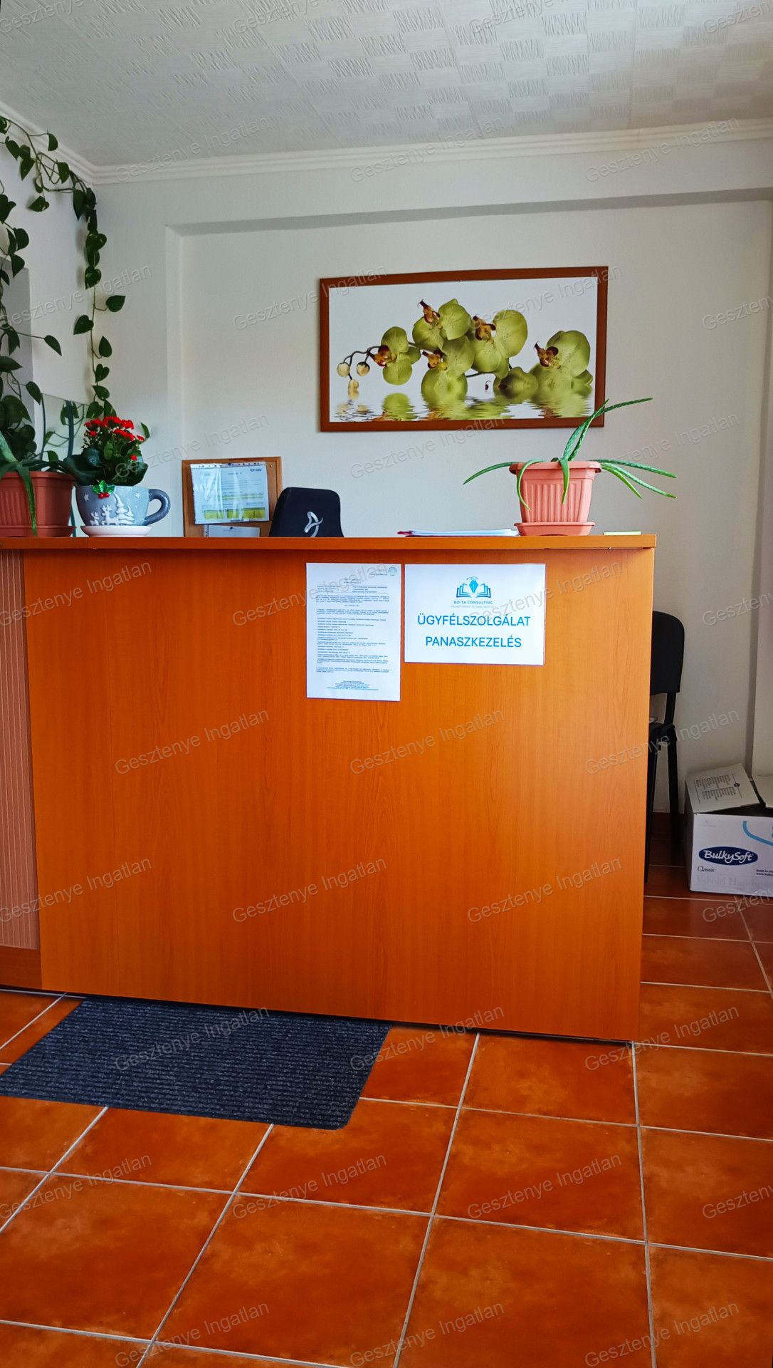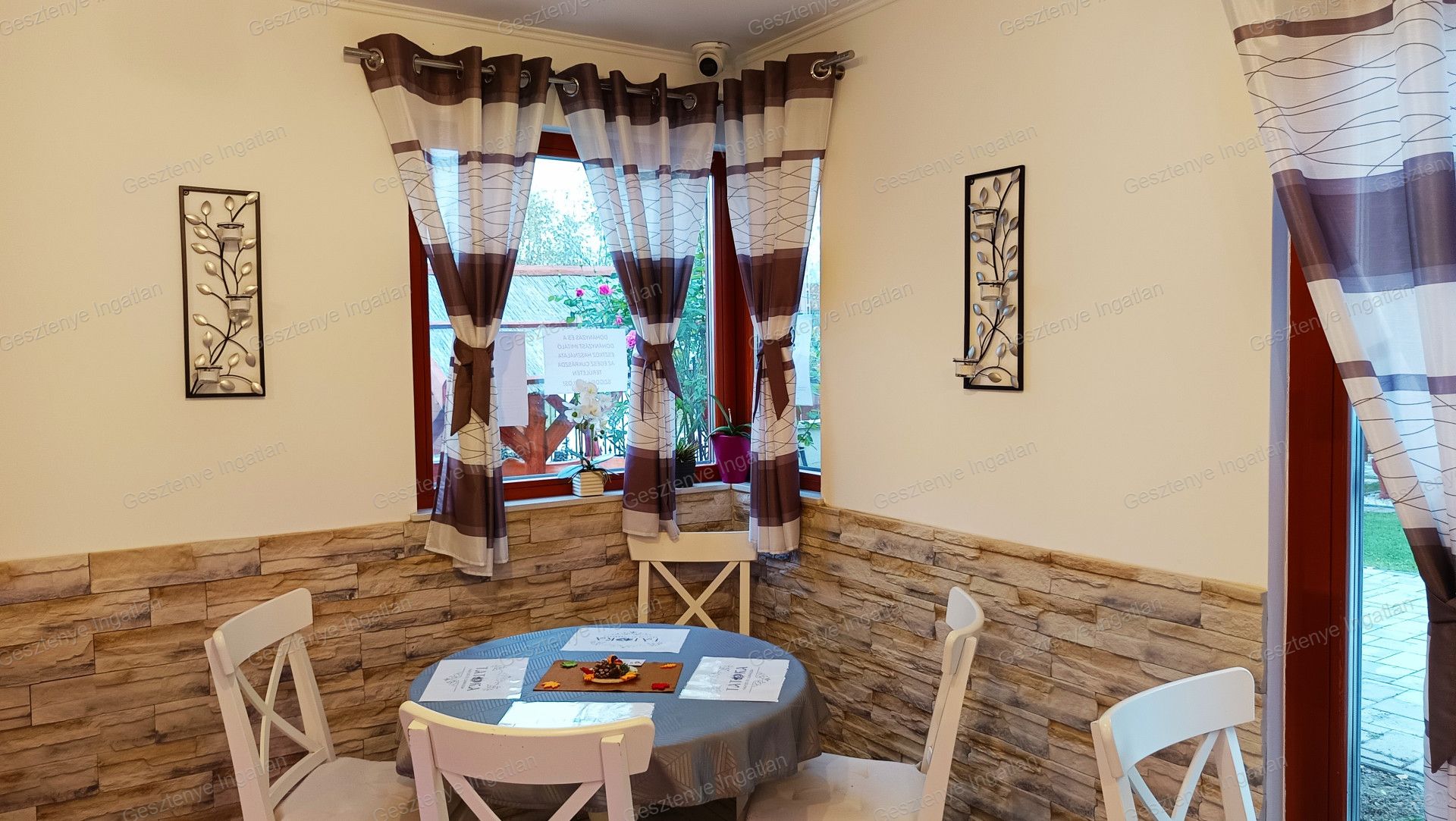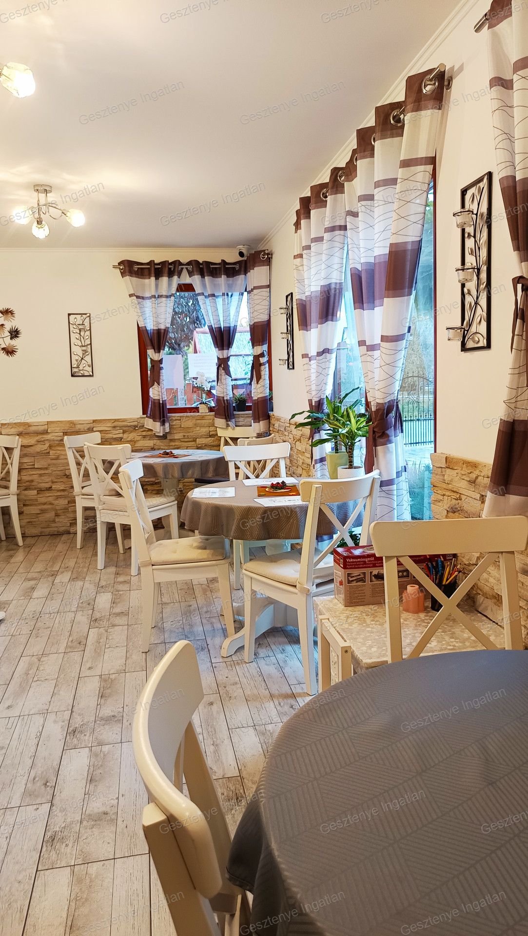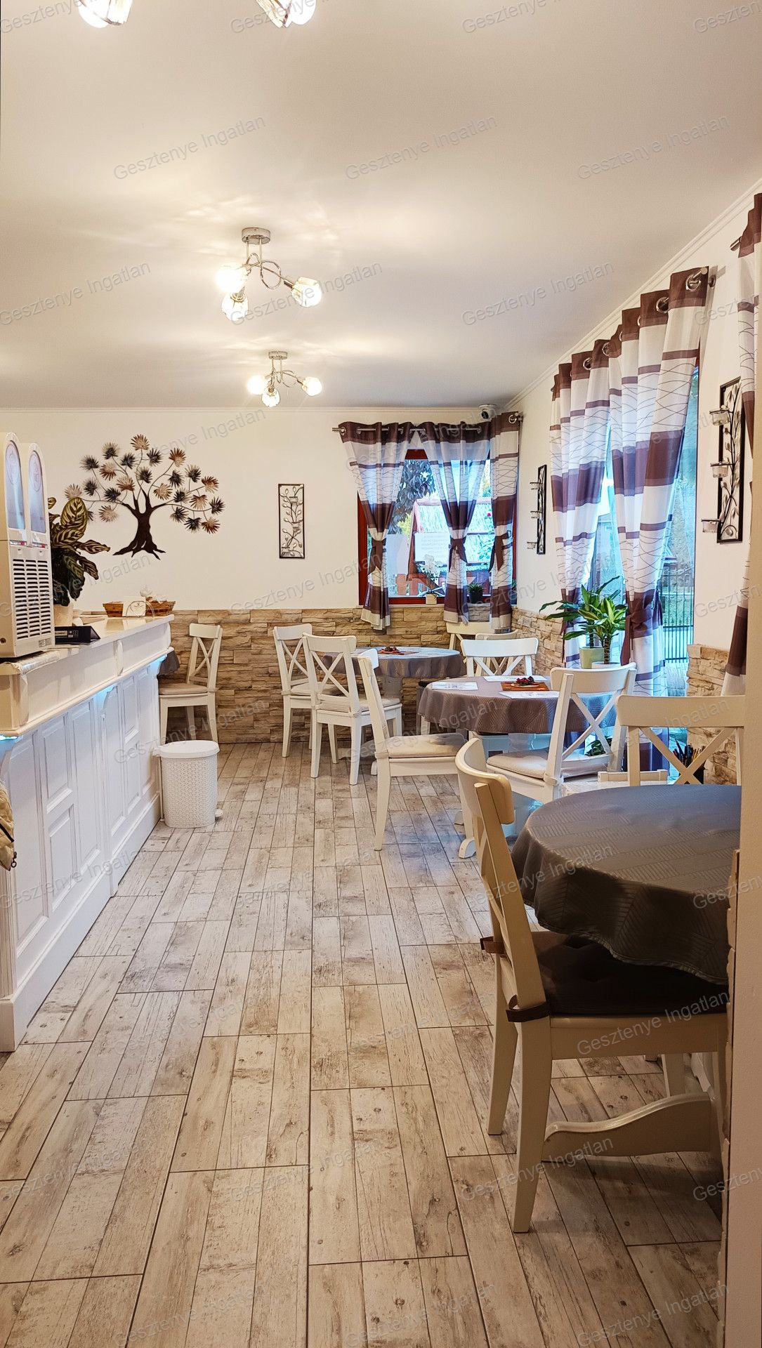 Elosztása: egy nagy vendégfogadó tér gyönyörű kiszolgáló pulttal, önálló helyiségben konyha, egy további ajtóval elzárt helyiség, innen nyílik egy zuhanyzós fürdőszoba, külön férfi és női WC került kialakításra közös előtérrel.