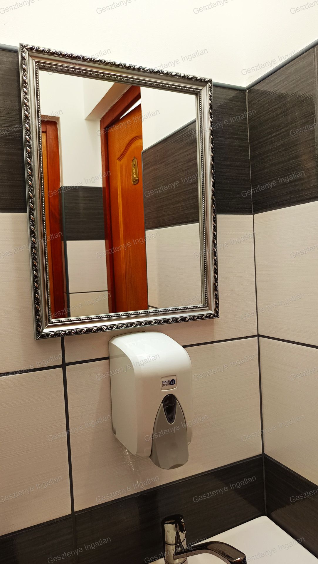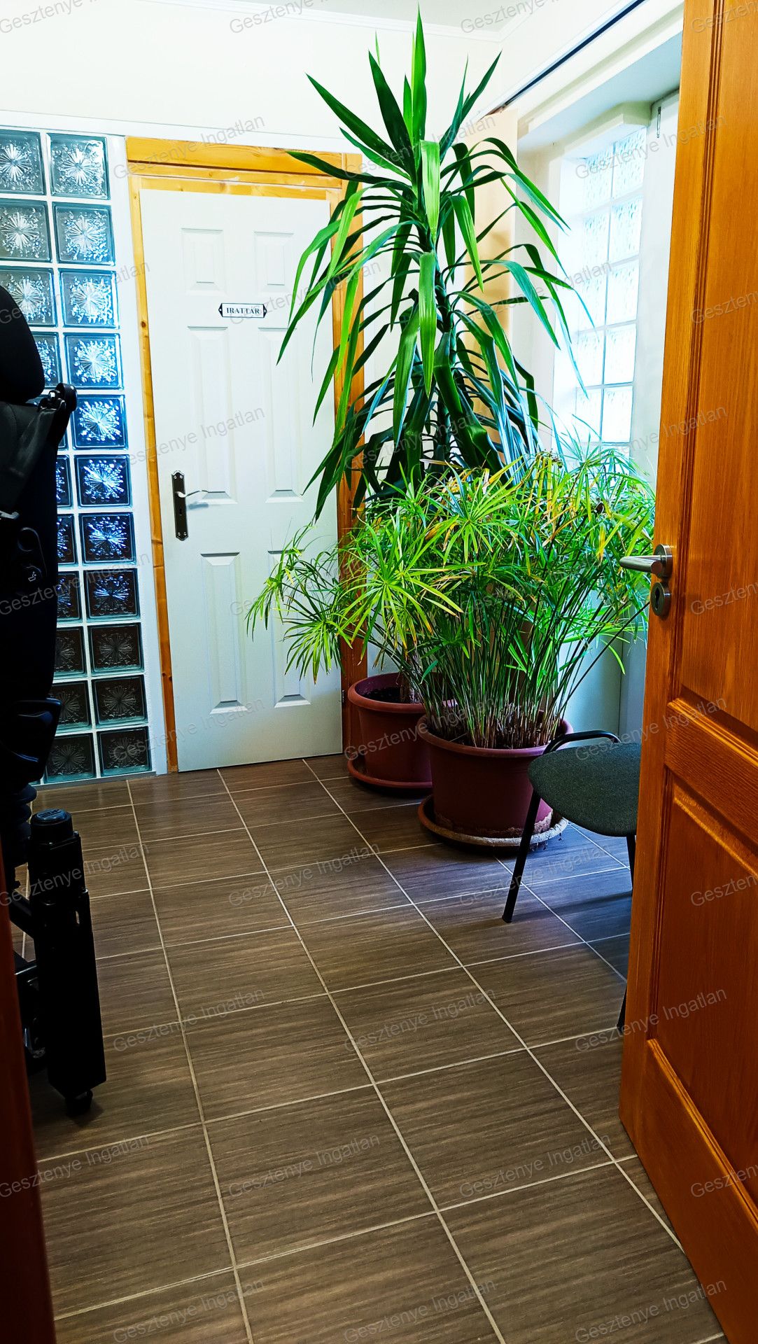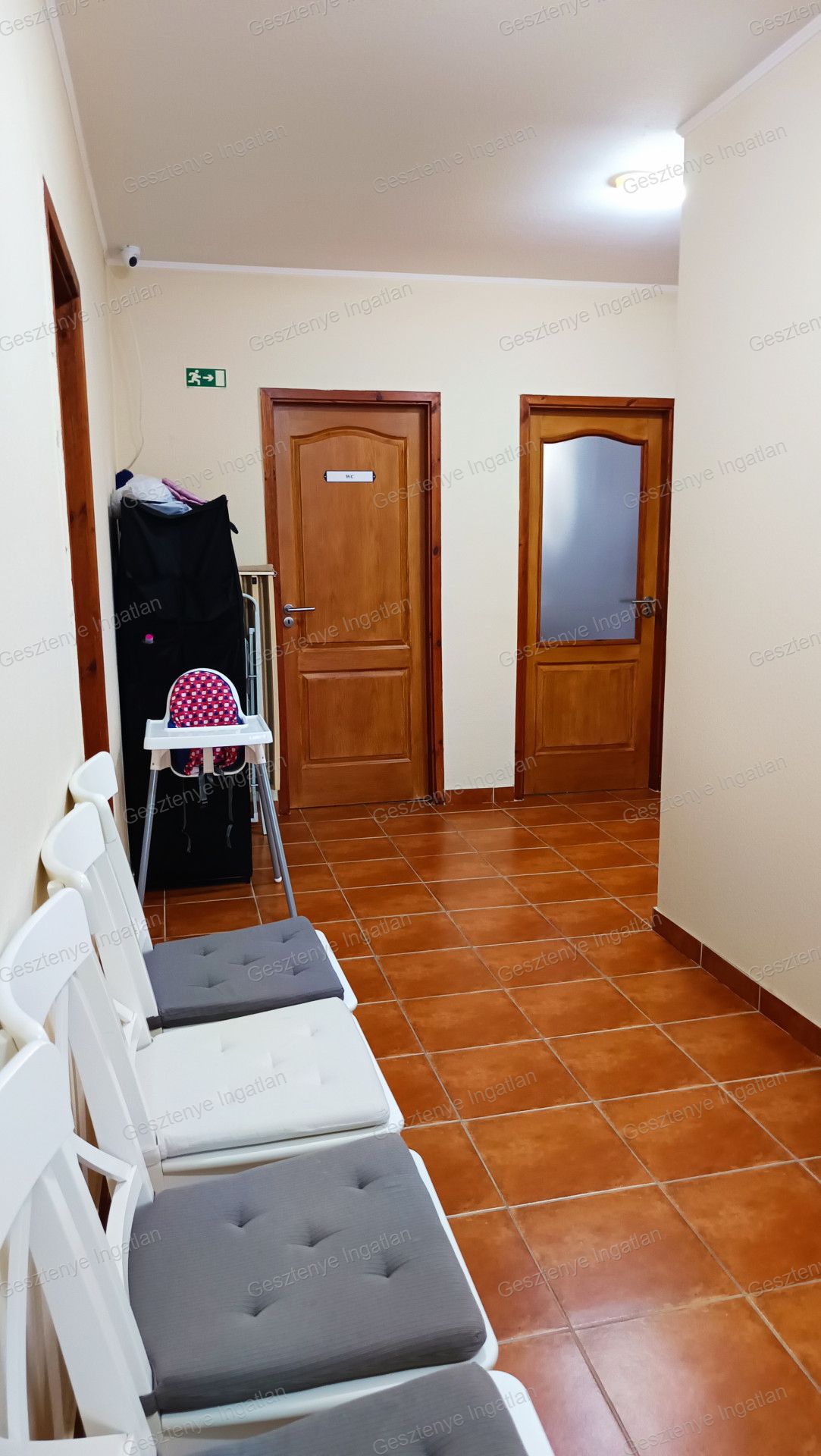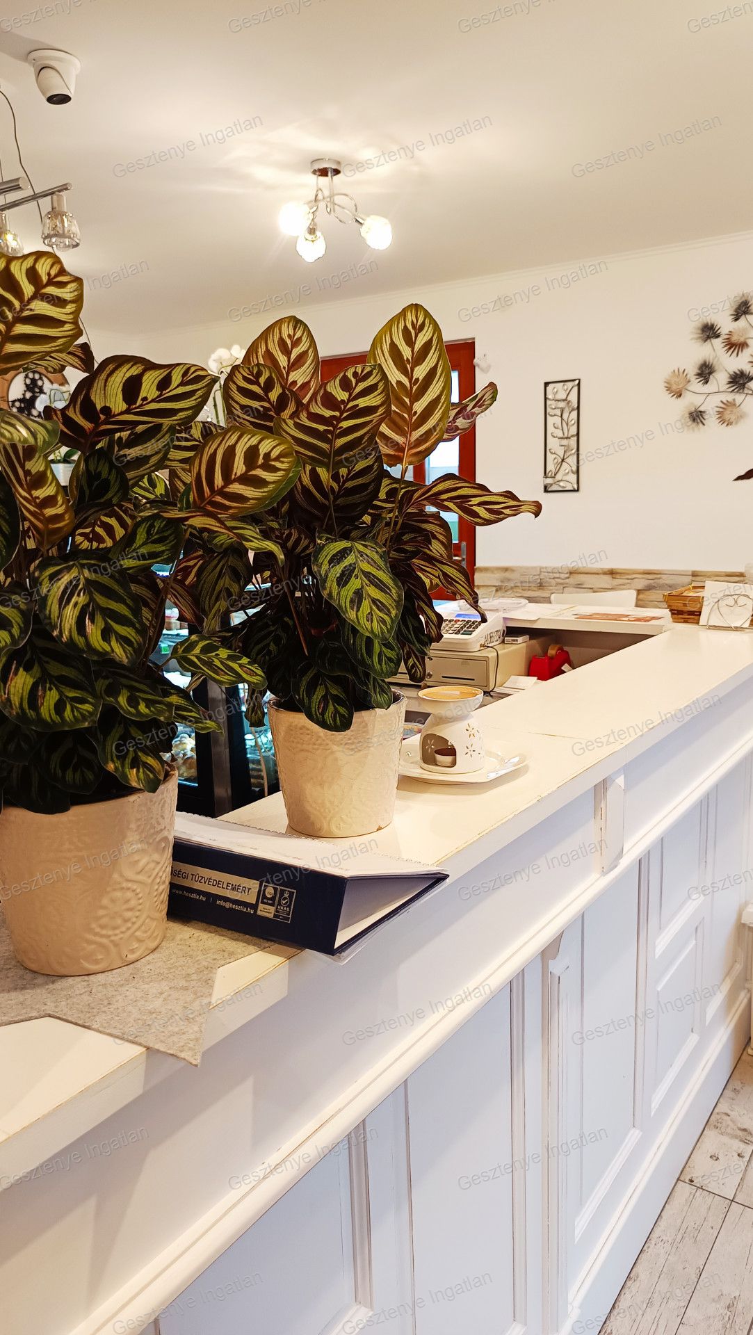 Elosztása: egy nagy vendégfogadó tér gyönyörű kiszolgáló pulttal, önálló helyiségben konyha, egy további ajtóval elzárt helyiség, innen nyílik egy zuhanyzós fürdőszoba, külön férfi és női WC került kialakításra közös előtérrel.