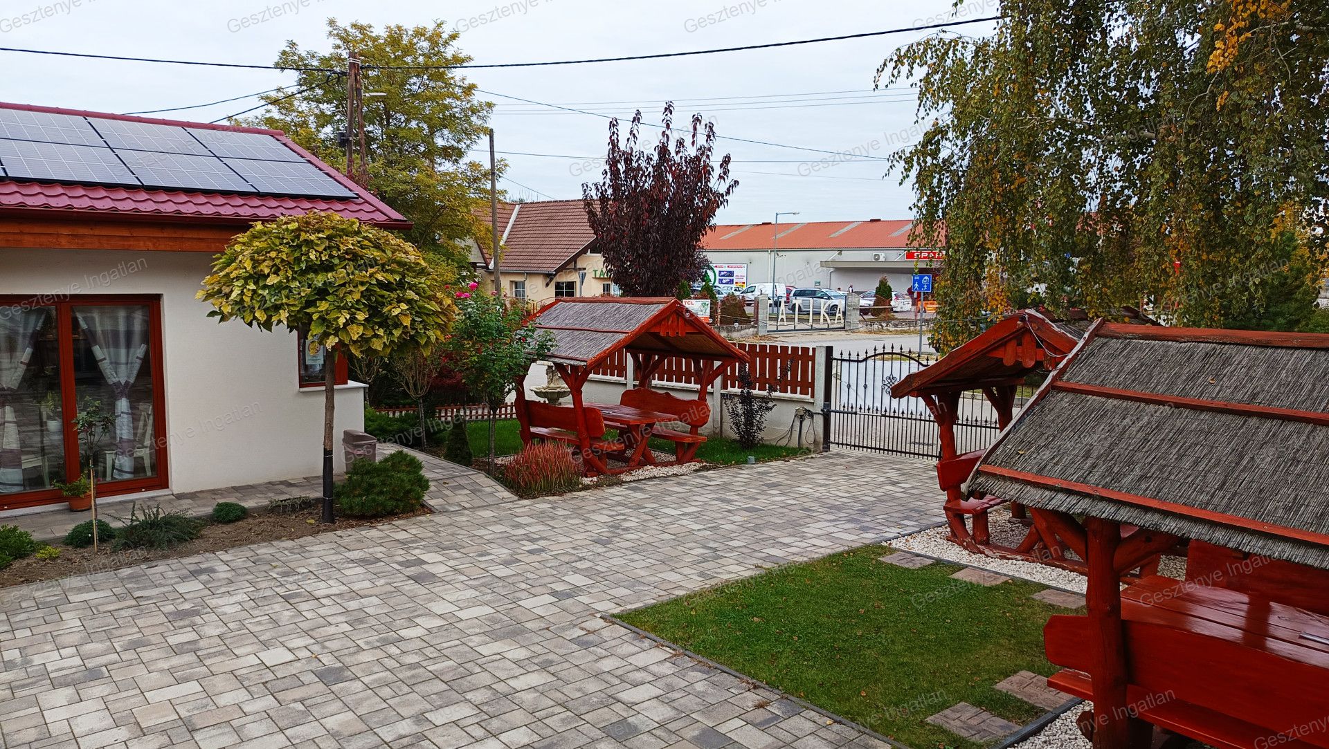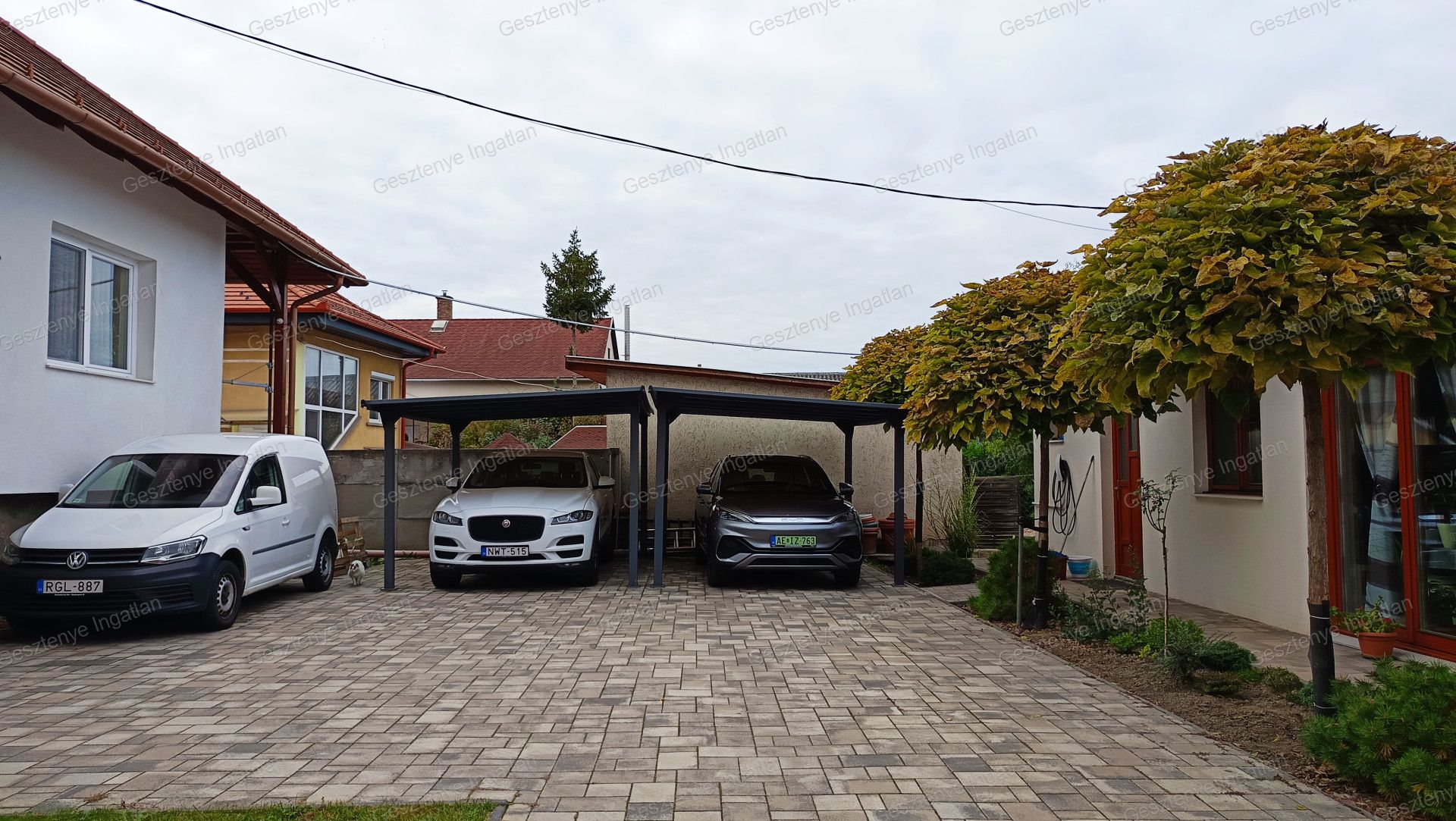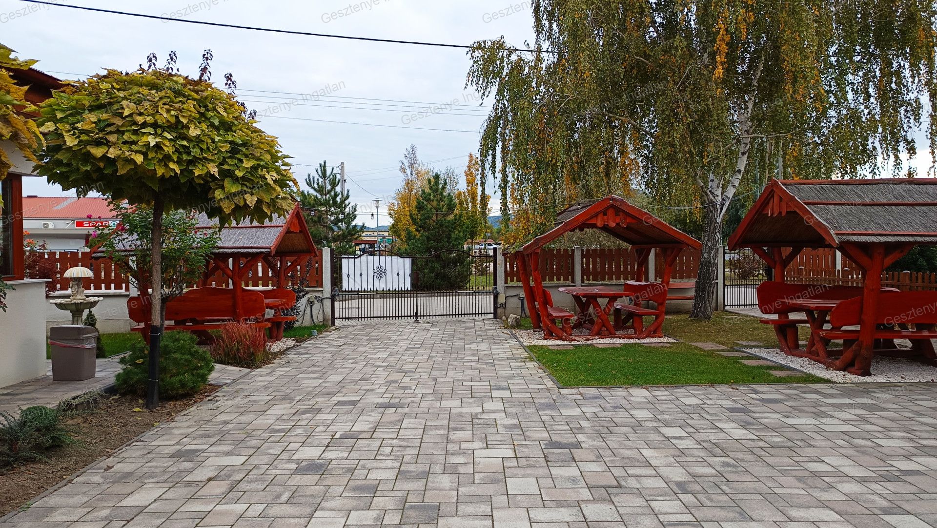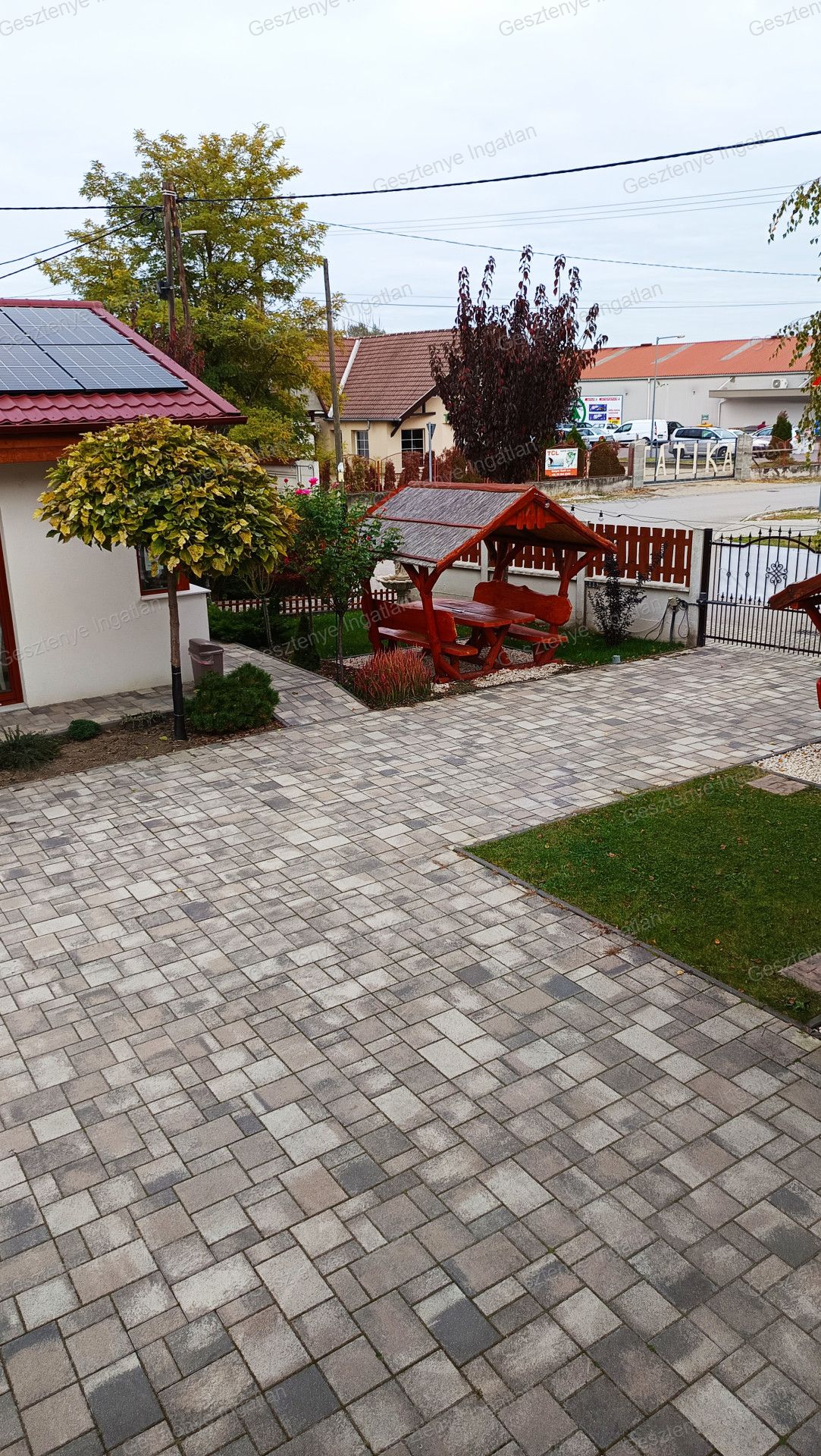 Az udvar rendezett, parkosított, térkövezett két autó számára fedett autóbeállóval, vendégparkolóval és elektromos kapuval ellátott.