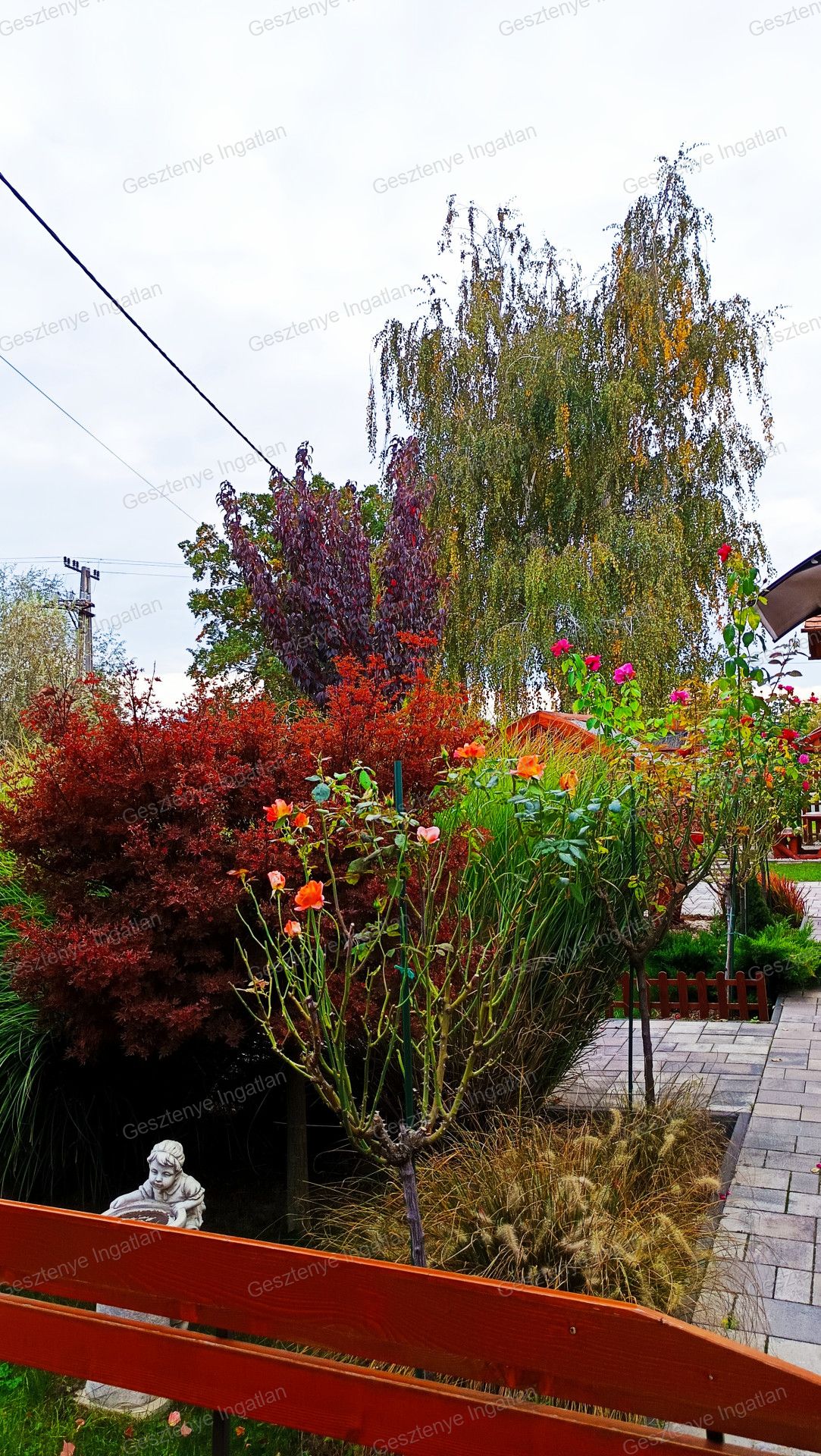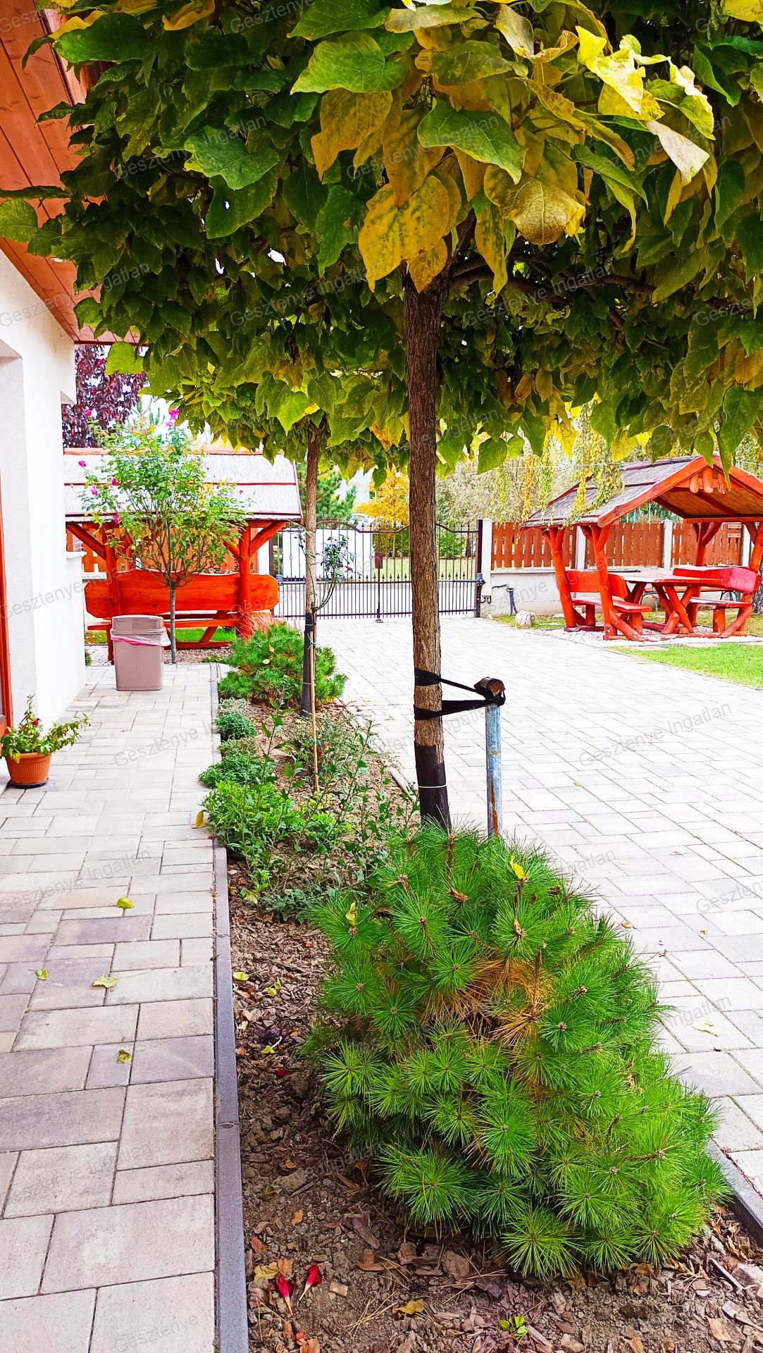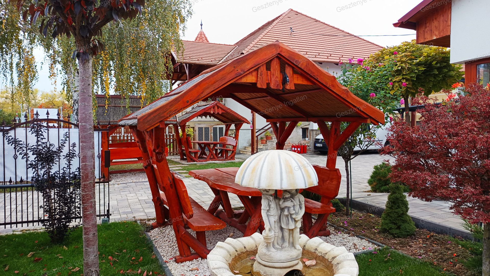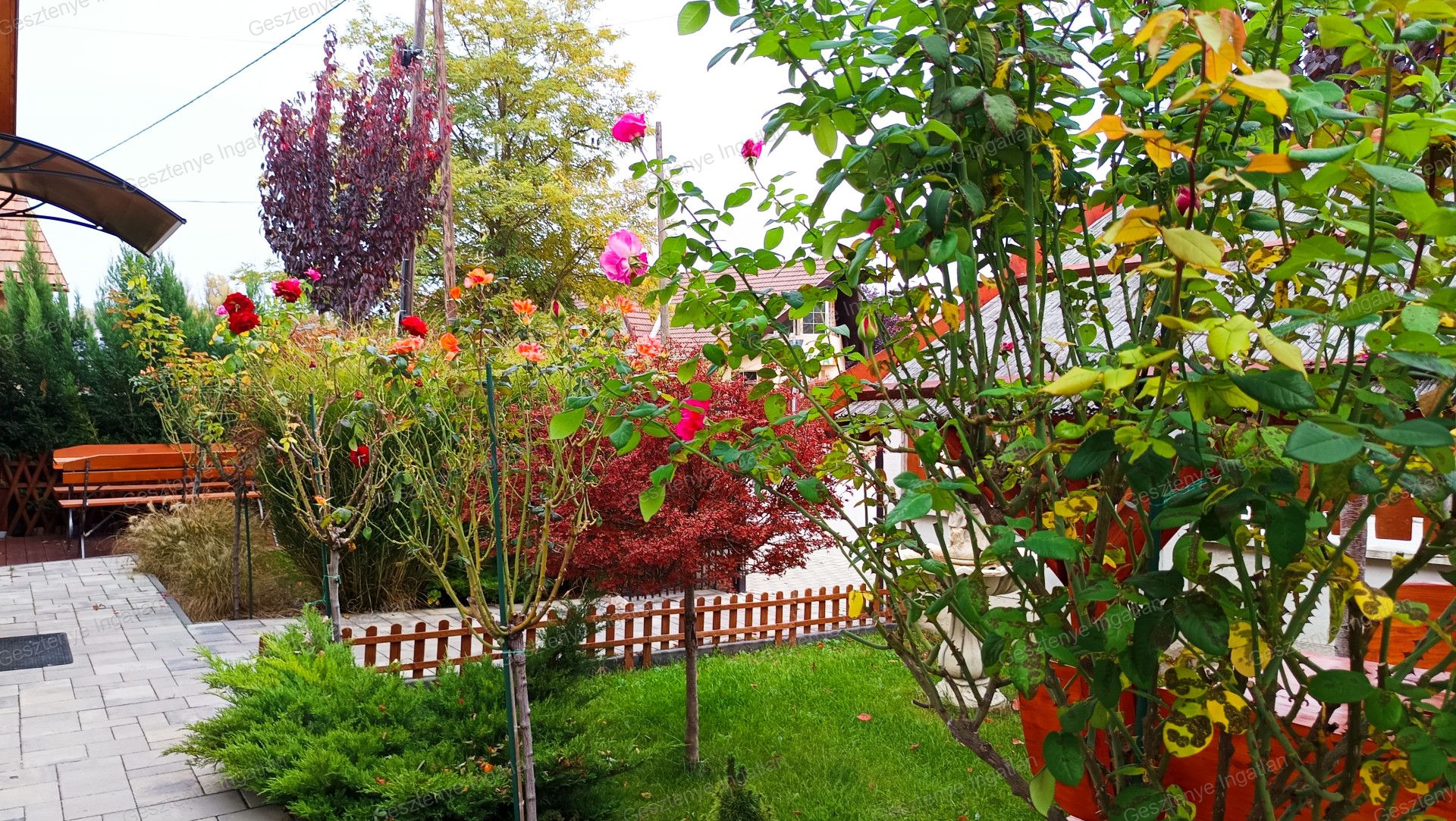 Az udvar rendezett, parkosított, térkövezett két autó számára fedett autóbeállóval, vendégparkolóval és elektromos kapuval ellátott.