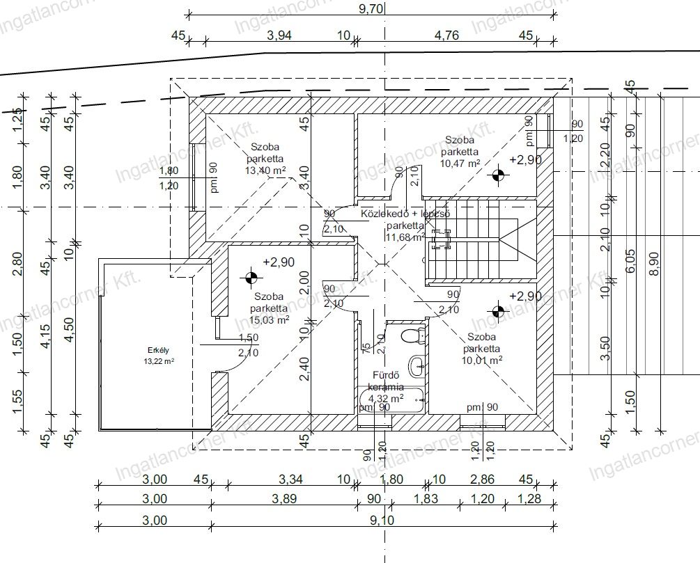 Teraszok: alsó szinten fedett terasz 16,80m2, emeleti terasz 13,22m2