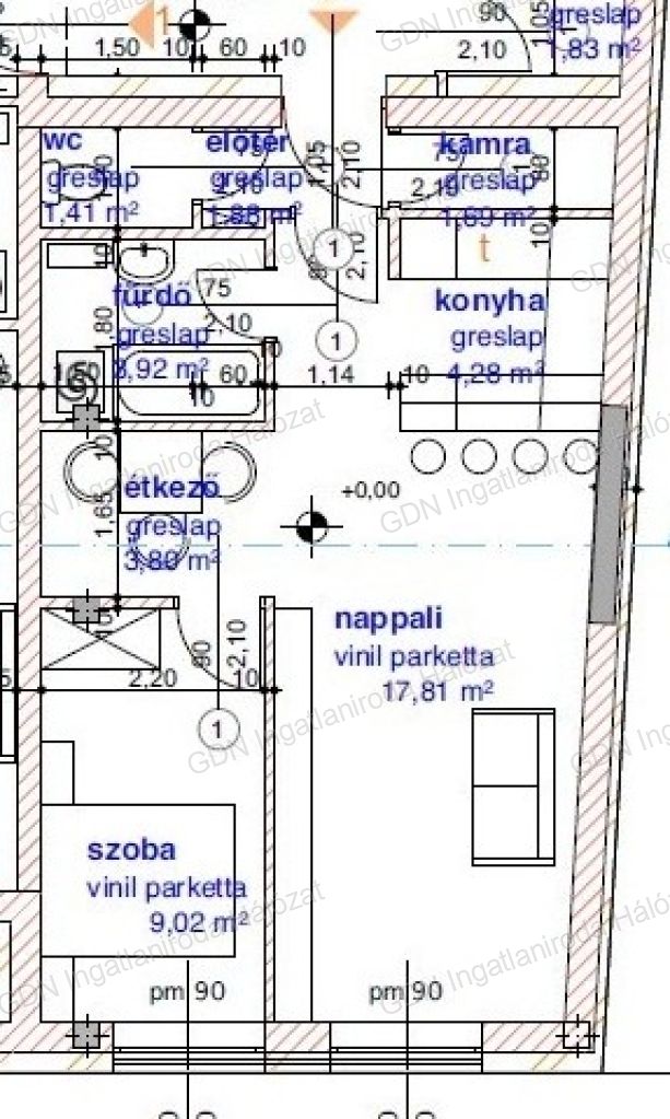 A lakás a tervek alapján konyha, étkező, nappali, szoba, kamra, fürdőszoba, mellékhelyiség, és előtér térfelosztású.