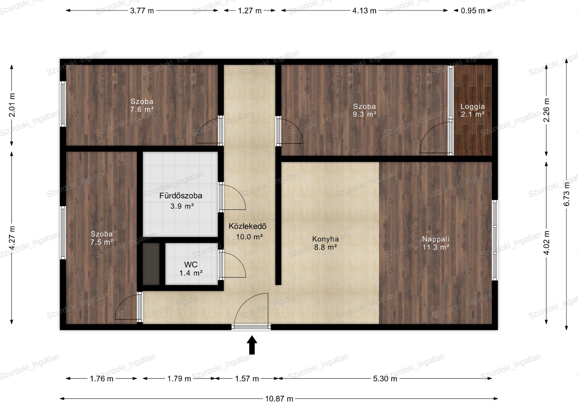 Elosztás: amerikai konyhás nappali + 3 különnyíló szoba