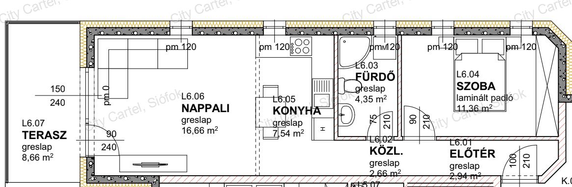 Beosztását tekintve egy amerikai konyás nappali, egy hálószoba, egy WC-s, zuhanyzós fürdőszoba, egy előszoba, közlekedő, és egy világos napos erkély került benne kialakításra.