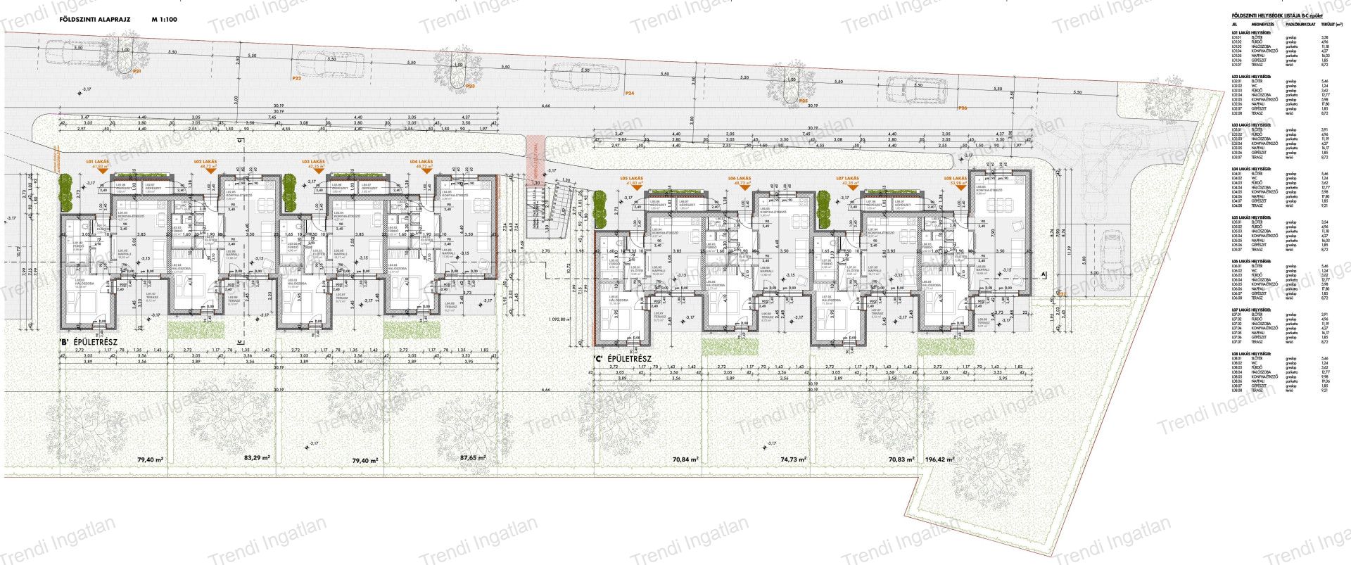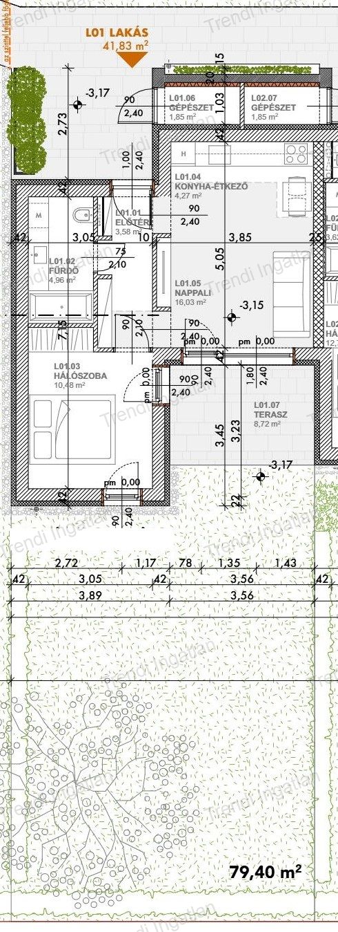 A meghirdetett földszinten található 40,02 nm-es lakásban amerikai konyhás nappali, szoba, fürdőszoba és előtér található. Nappaliból 8,72 nm-es terasz és 79,40 nm-es kertkapcsolat nyílik.