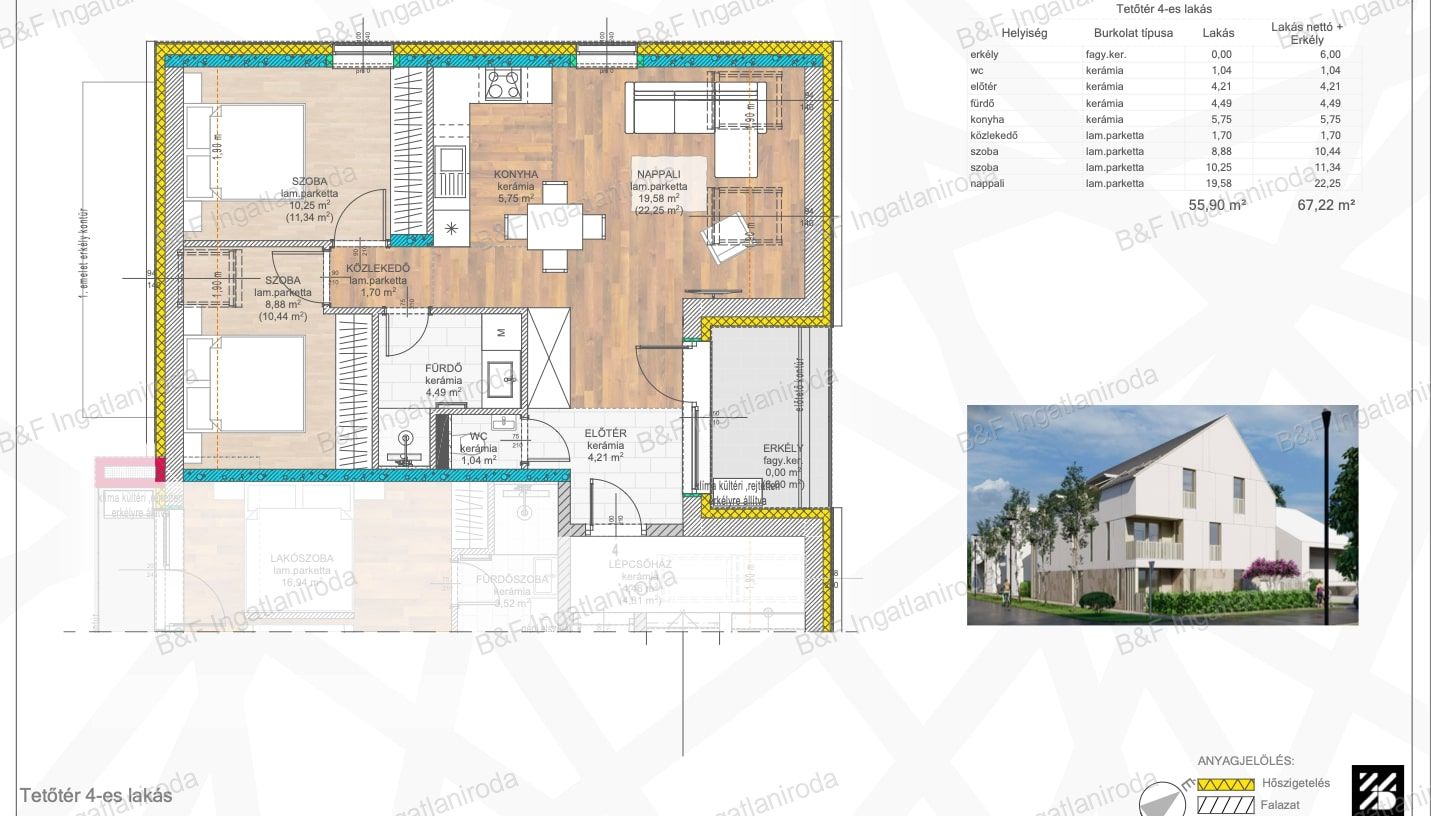 A lakás alapterülete 67,22 m2, két tágas szobával, hatalmas amerikai konyhás nappalival és erkéllyel is rendelkezik.