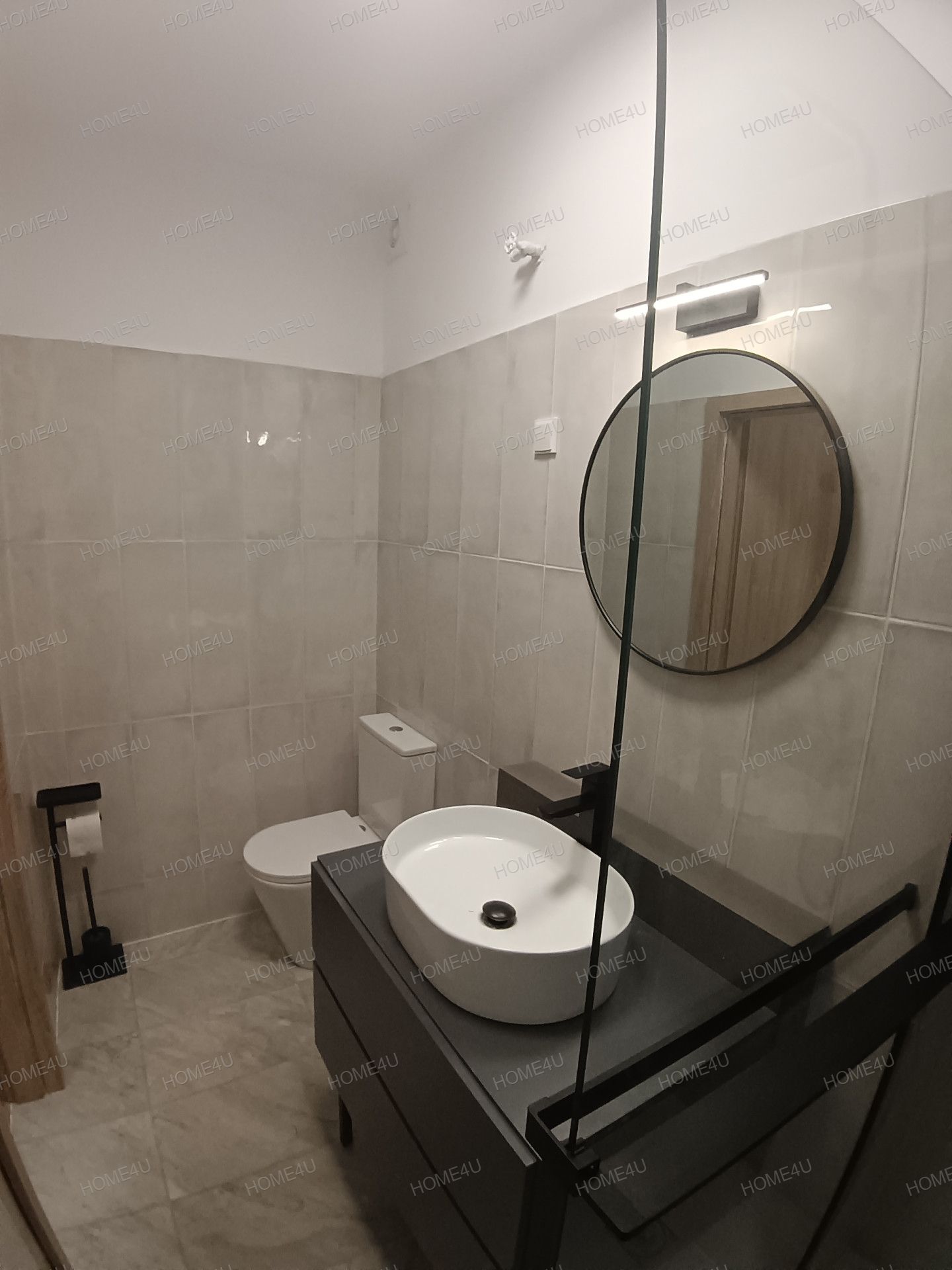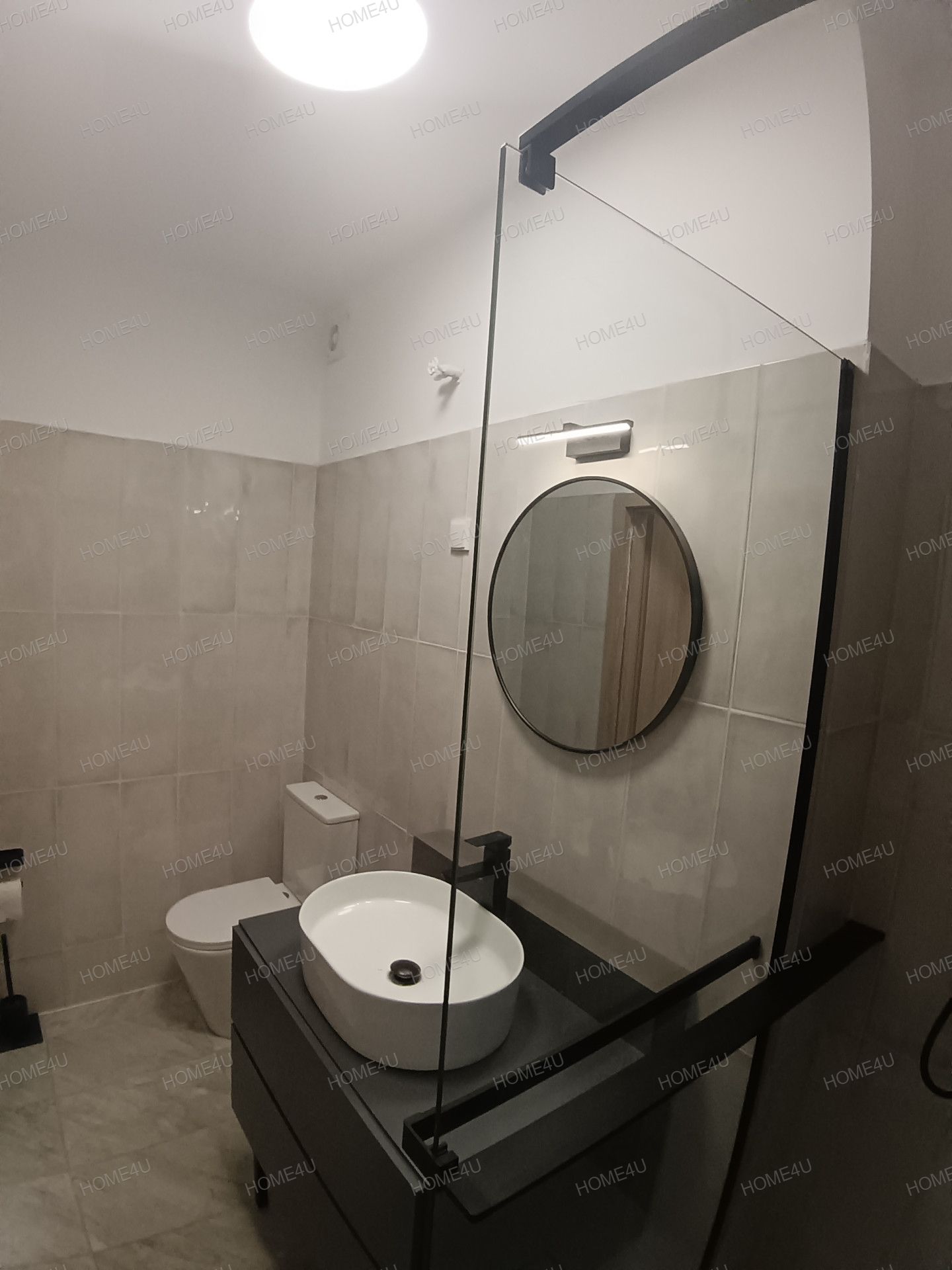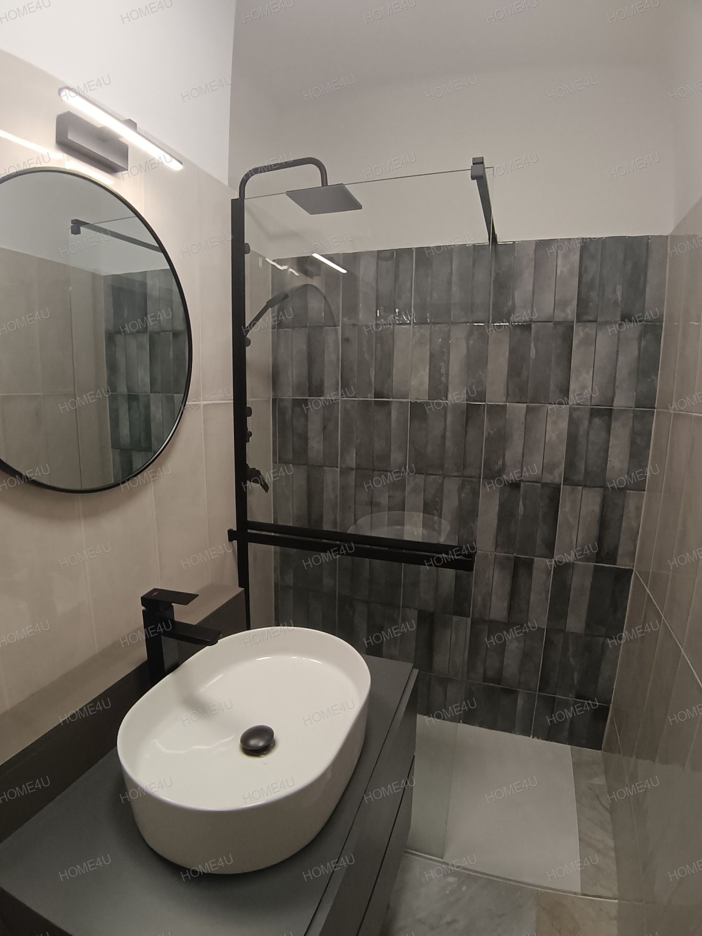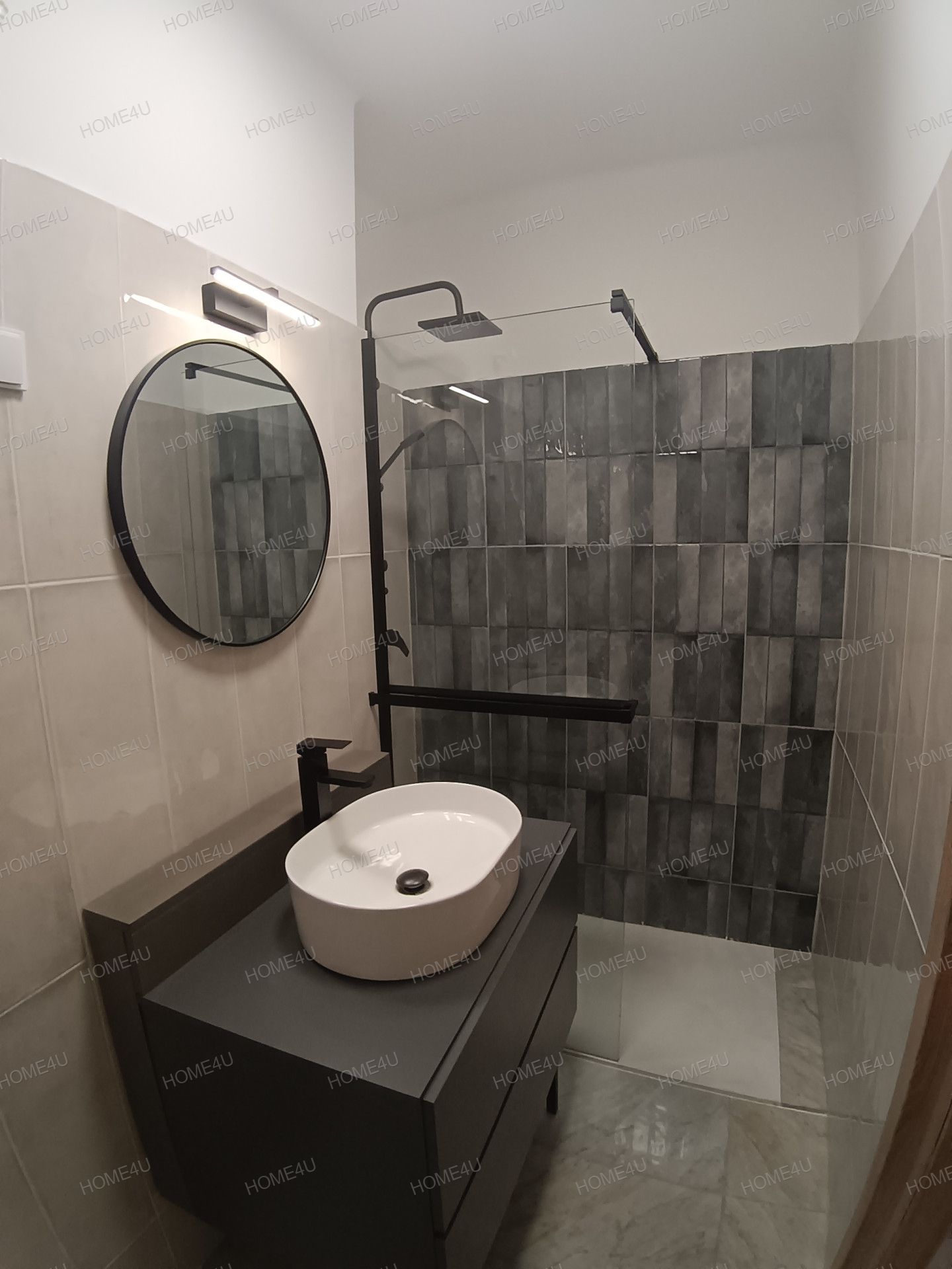 -minőségi burkolatokkal ellátott zuhanykabinos fürdőszoba alkotja