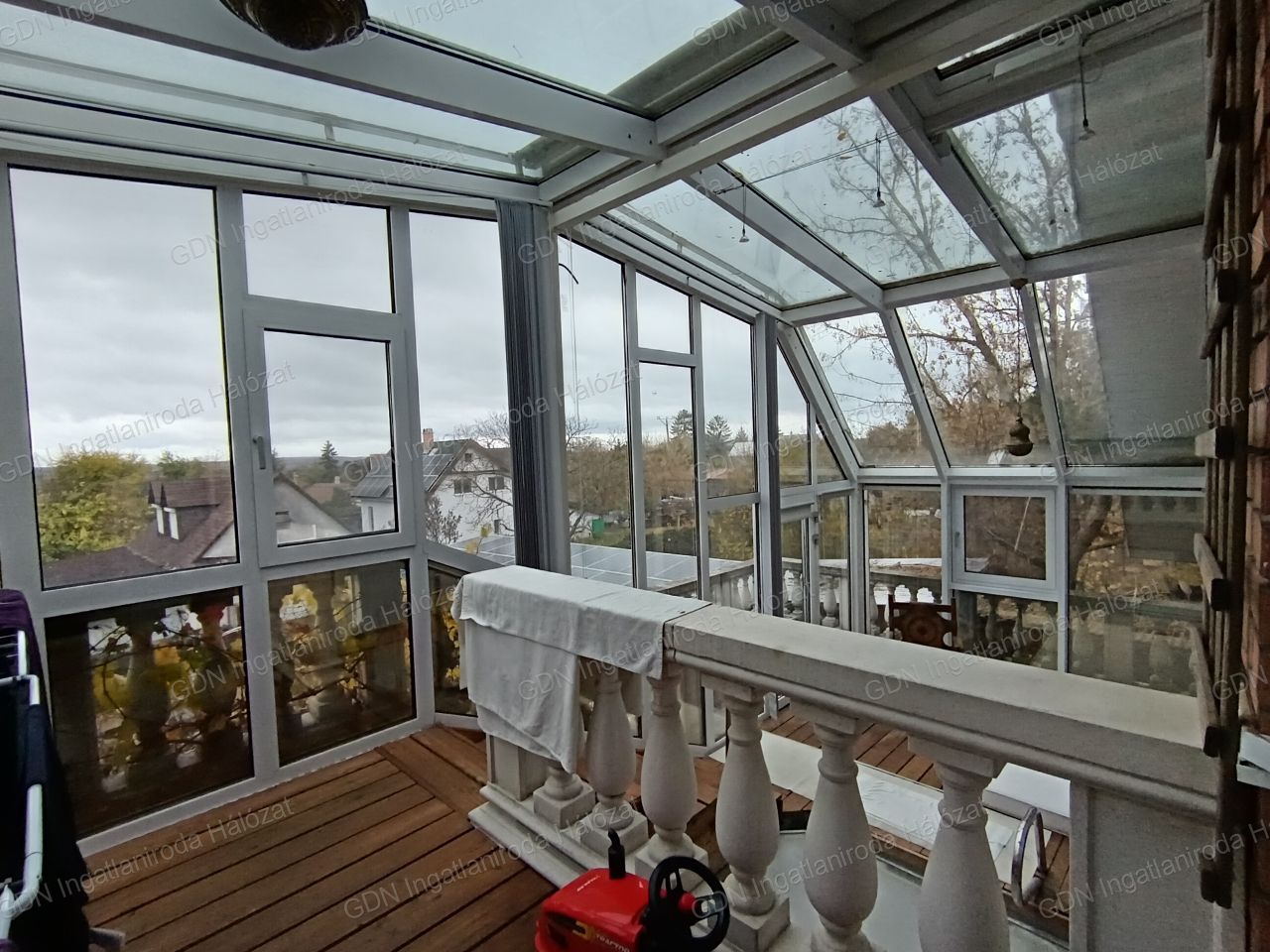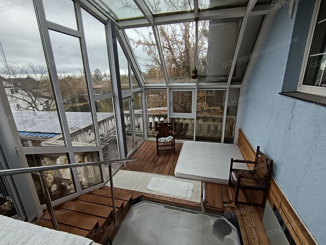 - földszint: előtér, szoba, második előtér, amelyből egy fürdőszoba és az amerikai konyhás nappali nyílik. A nappaliból ki lehet menni a beépített teraszra, téli kert hangulattal bír, fűthető tér, amelyen egy jakuzzi is elhelyezésre került.