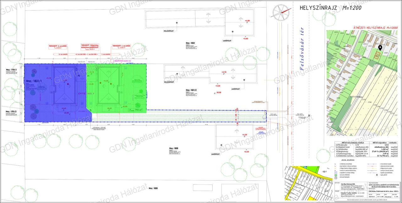 Az első házhoz 470 m²-es, míg a hátsó házhoz egy 560 m²-es, kizárólagos használatú, lekerített telekrész tartozik.