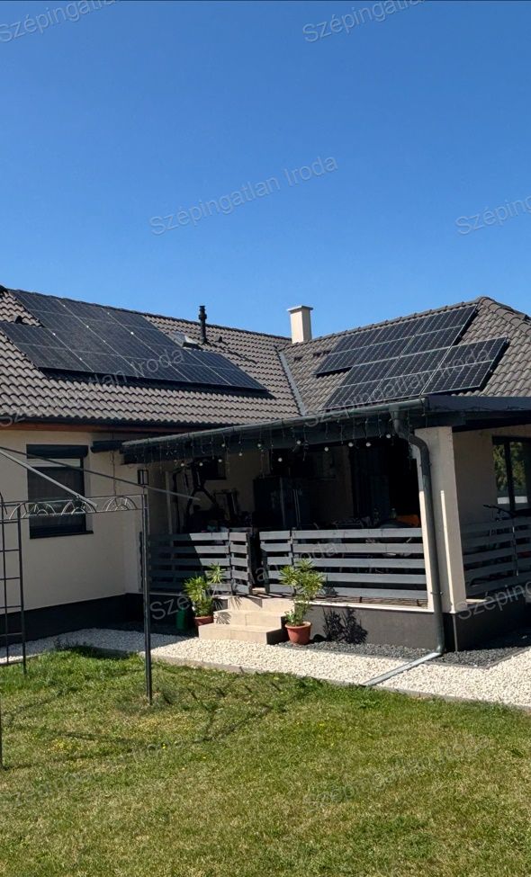 A Szépingatlan Iroda eladásra kínál Nagycenken, a Széchenyi lakóparkban,J ENERGIA TANUSÍTVÁNNYAL rendelkező, egy szintes, nagy terekkel és üvegfelületekkel rendelkező, minőségi kivitelezésű, családi házat. Az ingatlan 2017-ben épült, téglaépítésű, elrendezése kiváló, 14 cm homlokzatszigeteléssel és műanyag 3 rétegű hőszigetelt üvegezésű, alumínium redőnyökkel és rovarhálóval felszerelt külső nyílászárókkal készült. A lakótér hasznos alapterülete 116 m2, 4 hálószoba, amerikai konyha, nappali, 2 fürdőszoba, kamra és háztartási helyiség kialakításban. A konyhában a tökéletesen átgondolt megoldások számos elhelyezési lehetőséget biztosítanak, és megkönnyítik a napi munkát. A ház szíve a tágas nappali, a hozzá csatlakoztatott étkezővel és a 30 m2-es, kertkapcsolatos fedett terasszal olyan megoldás, amely a család központi élettere, modern és tágas megjelenésű. Az egyedileg megtervezett, gépekkel jól felszerelt konyhabútor, valamint a számtalan okosan kitalált praktikus beépített bútorzat a lakás részévé vált. A fűtés és a meleg víz szolgáltatás kondenzációs gázkazánról történik, a szobákban radiátor, a többi helyiségben padlófűtéssel. A 120 literes meleg víz tartályból egy nagyobb létszámú családnak is megfelelő mennyiségű használati víz áll rendelkezésre. A ház energia kiszolgálását 6 kwp-s napelemrendszer biztosítja 10 kWh-s sziget üzemű energiatárolóval. A épület kifejezetten jó fekvésű, körbe süti a nap téli időszakban is, így a napelem rendszer hatékonysága egész évre biztosított. A nyári melegben nagy teljesítményű klíma berendezés teszi kellemessé a lakás hőmérsékletét. A háztartási gépek védelmére a Dropson márkájú, gondozás- és sómentes vízlágyító berendezés is beszerelésre került. Az épületet 1007 m2 gondozott kert veszi körül, itt helyezték el a bográcsozót és a kerti szerszámok tárolására alkalmas házikót, de elfér itt egy gyermekjátszó, sőt még családi medence is a nyári meleg napokban. A kert nyári gondozására, az öntözéshez külön almérő került felszerelésre. A ház előtti térkövezett parkoló 3 autónak biztosít helyet. Az ingatlan további különleges jellemzői közé tartozik - ha elektromos üzemű autóval közlekedik - a saját telken belül kiépített 11 KW-os autó töltő rendszer. A kerti beállás motorizált úszókapun keresztül is lehetséges. Az épület, illetve a család biztonságát szolgálja az 5 állásos Hikvision kamerarendszer. Végül, a sok extra igényű elektromos berendezés megfelelő működését a 3X25 Amper biztosítja. Ajánljuk ezt a kiemelkedő minőségű, sok extrával felszerelt házat mindazon kedves Ügyfeleink részére, akik otthonteremtési céllal vásárolnak ingatlant. Ha hitelre lenne szüksége, független hitelügyintézők megkeresi az Ön számára legkedvezőbb pénzügyi megoldást. Eladási ár: 149,9 mFt.
