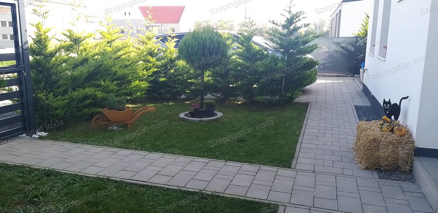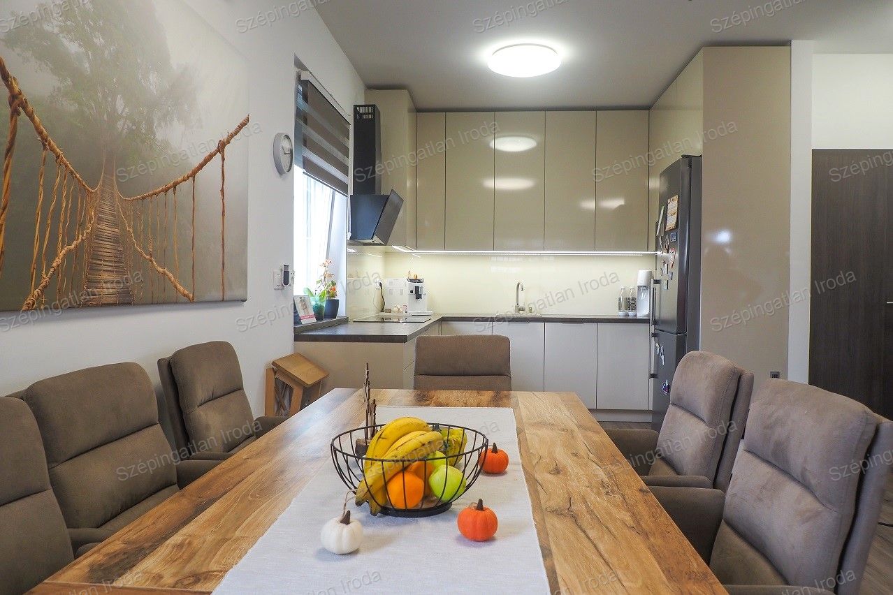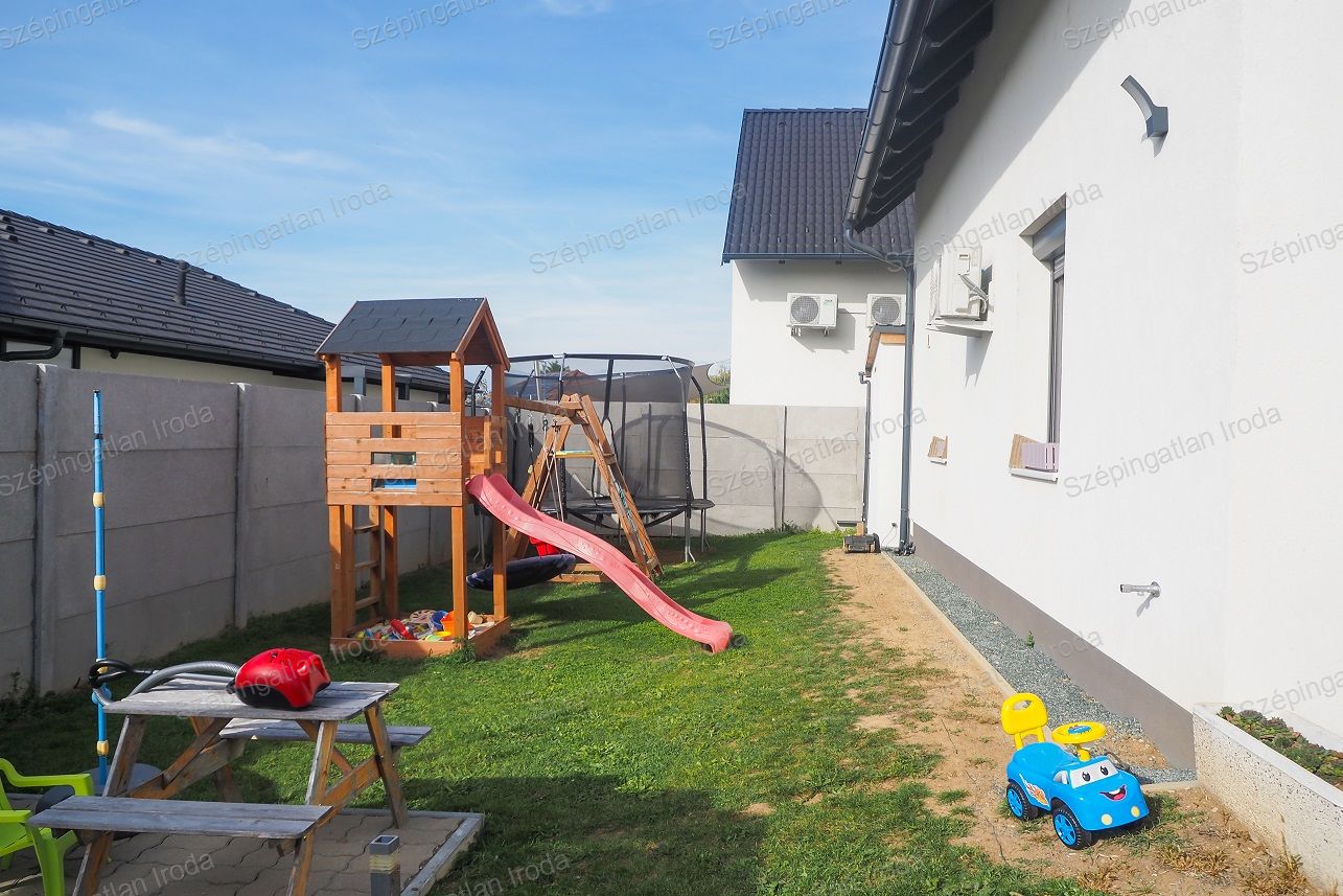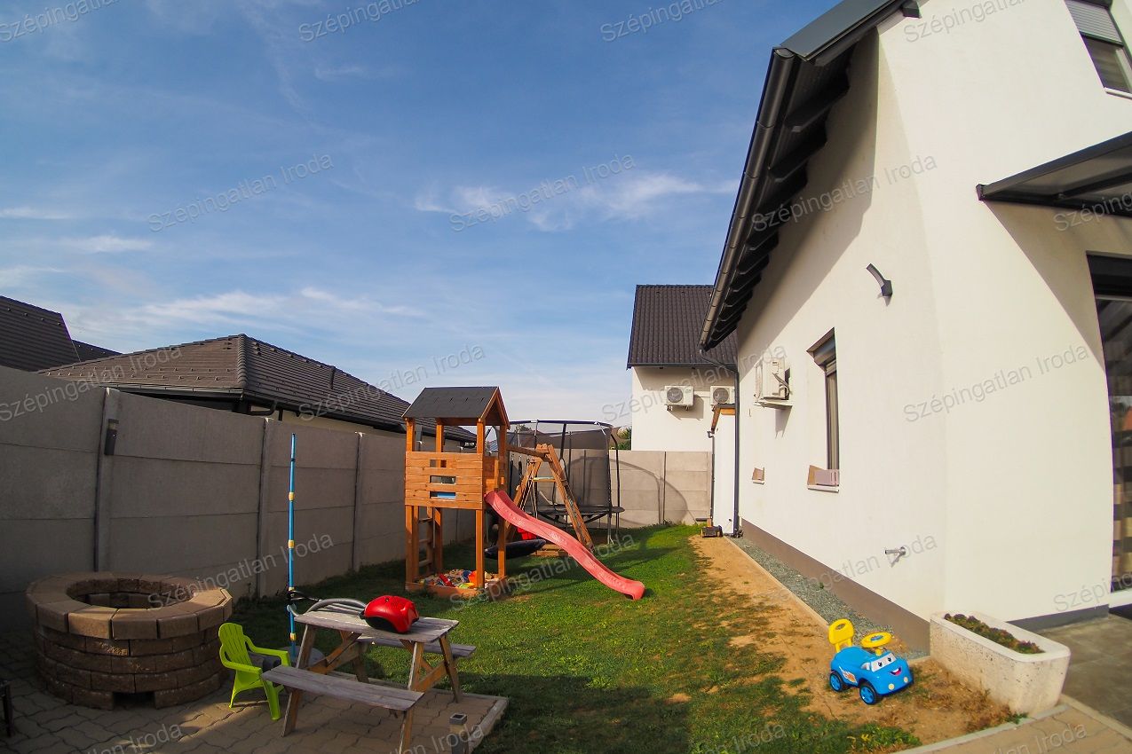 A Szépingatlan Iroda eladásra kínál Nagycenken, a Széchenyi lakóparkban, kulturált családi házas környezetben, egy 2021-ben kiváló minőségben megépített, praktikus elosztású, 2 szintes önálló családi házat. A telek 270m2, a ház hasznos alapterülete 93m2. A lakótérben amerikai konyha nappali, három hálószoba, 2 fürdőszoba és gardrób helyiség és udvari tároló található. Az épület tégla szerkezetű a fő falak 30 cm-es, a válaszfalak 10 cm-es válaszfal téglából készültek, az energetikai szabványnak megfelelően 18 cm-es homlokzati szigeteléssel. A külső nyílászárók műanyag szerkezetű, fokozott hőszigetelésű 3 rétegű üvegezésűek, belül fehér, kívül antracit színben, vakolható tokos redőnyökkel és szúnyoghálóval felszereltek. Az ingatlanba belépve az előszobából a nappali étkezőkonyha tágas terébe érkezünk Az egyedileg megtervezett, gépekkel jól felszerelt konyhabútor, valamint a számtalan okosan kitalált beépített bútorzat a lakás részévé vált, a vételűr részét képezi. A nappalihoz szervesen kapcsolódó 19 m2-es, déli tájolású fedett terasz és az udvar adja a lehetőséget, hogy tavasztól őszig a külső tér is egyenrangú része lehet az otthonnak. Az éjszakai élettér az emeleten ideálisan helyezkedik el, jól elkülönülve a közösségi tértől, mind közlekedőből nyílik. A fűtés és a meleg víz szolgáltatás energia takarékos gáz-cirkó kazánnal megoldott, padlófűtés rendszerrel. A nyári melegben hűtő-fűtő klíma biztosítja a ház kellemes hőmérsékletét. A háztartási gépek védelmére vízlágyító berendezés is beszerelésre került. A korszerű nyílászáróknak és a jó szigetelésnek köszönhetően az ingatlan rezsiköltsége rendkívül alacsonyan tartható. Az épületben alkalmazott műszaki megoldások, meleg és hideg burkolatok mind jó minőségűek, hibátlanok, egymással színben harmonizálnak. Műszakilag kifogástalan állapotban van az ingatlan. A kertben a kerti szerszámok tárolására egy 6 m2-es tároló található. A gépkocsik számára egy dupla férőhelyes térkövezett autóbeálló áll rendelkezésre közvetlen bejárattal a házhoz. A környezet rendezett, a szomszédok barátságosak, 2 gyermekes családoknak ideális otthon. Ha vásárláshoz hitelre van szüksége, hitelügyintéző Kollégánk segít Önnek megtalálni a piacon fellelhető legkedvezőbb hitelkonstrukciót. Ára: 110 mFt. Érd.: 003630 520 6055, [email protected]