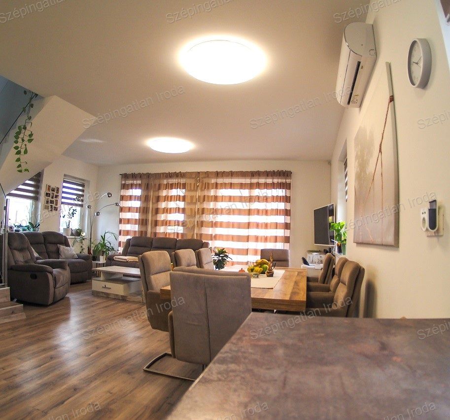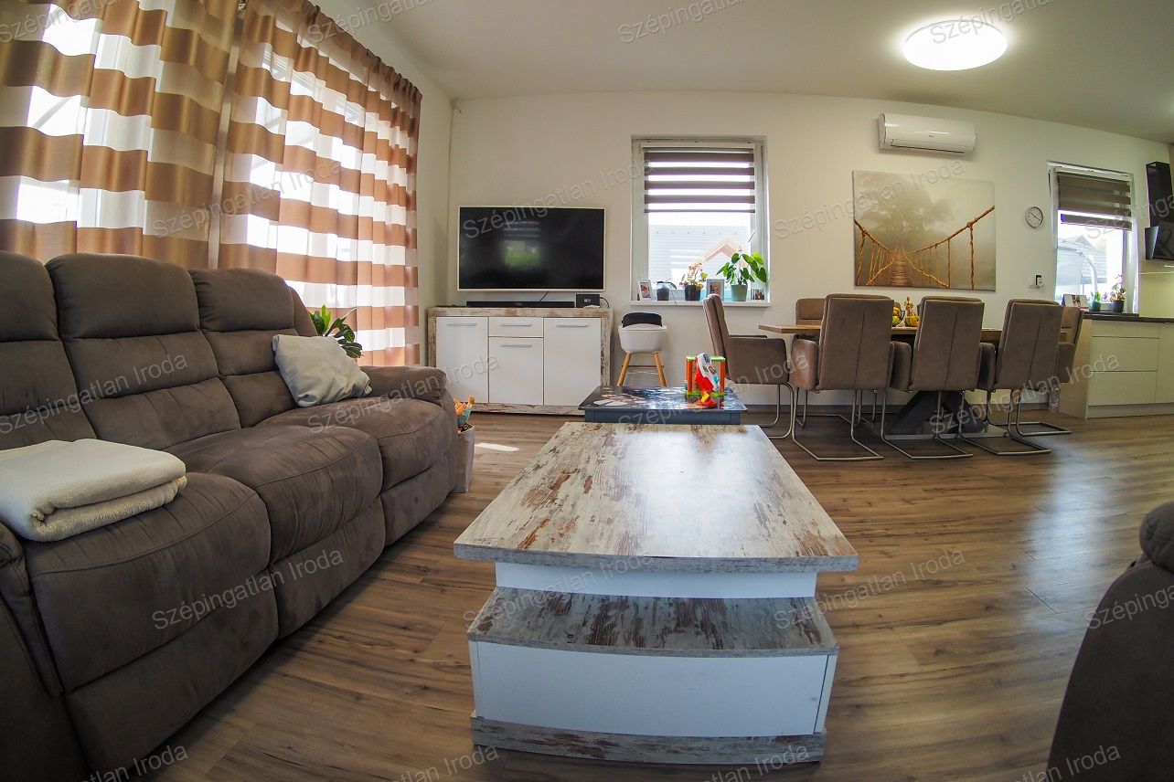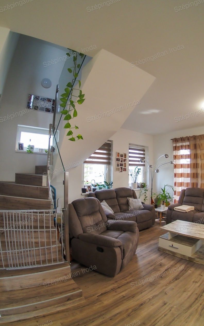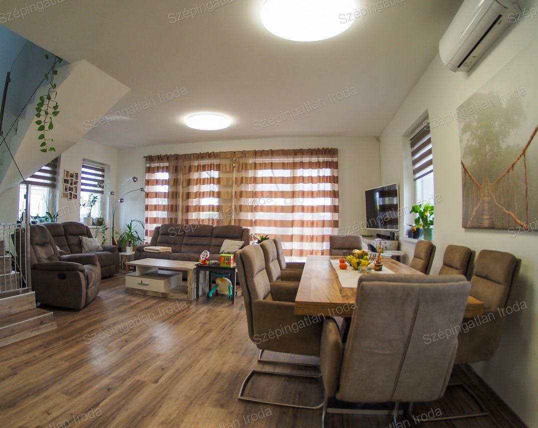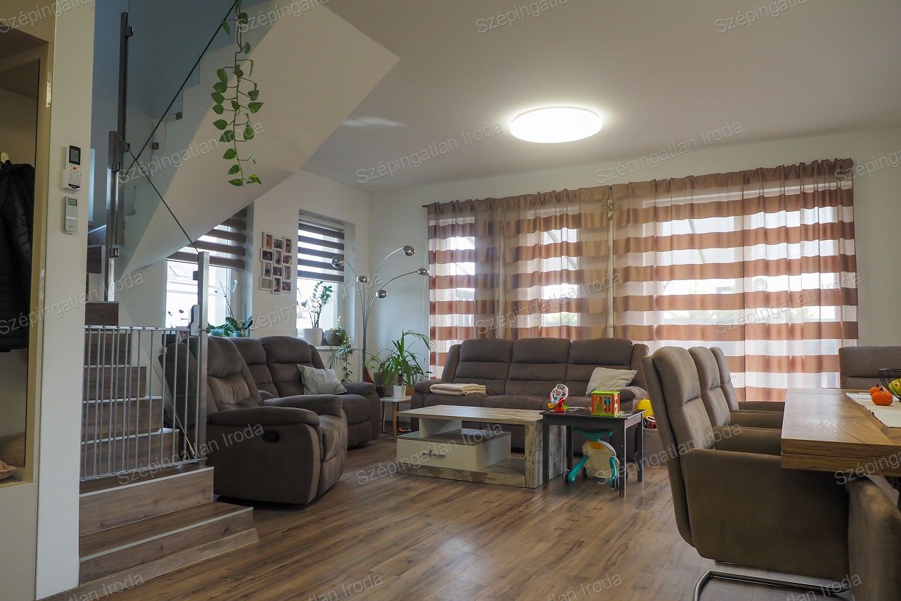 A Szépingatlan Iroda eladásra kínál Nagycenken, a Széchenyi lakóparkban, kulturált családi házas környezetben, egy 2021-ben kiváló minőségben megépített, praktikus elosztású, 2 szintes önálló családi házat. A telek 270m2, a ház hasznos alapterülete 93m2. A lakótérben amerikai konyha nappali, három hálószoba, 2 fürdőszoba és gardrób helyiség és udvari tároló található. Az épület tégla szerkezetű a fő falak 30 cm-es, a válaszfalak 10 cm-es válaszfal téglából készültek, az energetikai szabványnak megfelelően 18 cm-es homlokzati szigeteléssel. A külső nyílászárók műanyag szerkezetű, fokozott hőszigetelésű 3 rétegű üvegezésűek, belül fehér, kívül antracit színben, vakolható tokos redőnyökkel és szúnyoghálóval felszereltek. Az ingatlanba belépve az előszobából a nappali étkezőkonyha tágas terébe érkezünk Az egyedileg megtervezett, gépekkel jól felszerelt konyhabútor, valamint a számtalan okosan kitalált beépített bútorzat a lakás részévé vált, a vételűr részét képezi. A nappalihoz szervesen kapcsolódó 19 m2-es, déli tájolású fedett terasz és az udvar adja a lehetőséget, hogy tavasztól őszig a külső tér is egyenrangú része lehet az otthonnak. Az éjszakai élettér az emeleten ideálisan helyezkedik el, jól elkülönülve a közösségi tértől, mind közlekedőből nyílik. A fűtés és a meleg víz szolgáltatás energia takarékos gáz-cirkó kazánnal megoldott, padlófűtés rendszerrel. A nyári melegben hűtő-fűtő klíma biztosítja a ház kellemes hőmérsékletét. A háztartási gépek védelmére vízlágyító berendezés is beszerelésre került. A korszerű nyílászáróknak és a jó szigetelésnek köszönhetően az ingatlan rezsiköltsége rendkívül alacsonyan tartható. Az épületben alkalmazott műszaki megoldások, meleg és hideg burkolatok mind jó minőségűek, hibátlanok, egymással színben harmonizálnak. Műszakilag kifogástalan állapotban van az ingatlan. A kertben a kerti szerszámok tárolására egy 6 m2-es tároló található. A gépkocsik számára egy dupla férőhelyes térkövezett autóbeálló áll rendelkezésre közvetlen bejárattal a házhoz. A környezet rendezett, a szomszédok barátságosak, 2 gyermekes családoknak ideális otthon. Ha vásárláshoz hitelre van szüksége, hitelügyintéző Kollégánk segít Önnek megtalálni a piacon fellelhető legkedvezőbb hitelkonstrukciót. Ára: 110 mFt. Érd.: 003630 520 6055, [email protected]