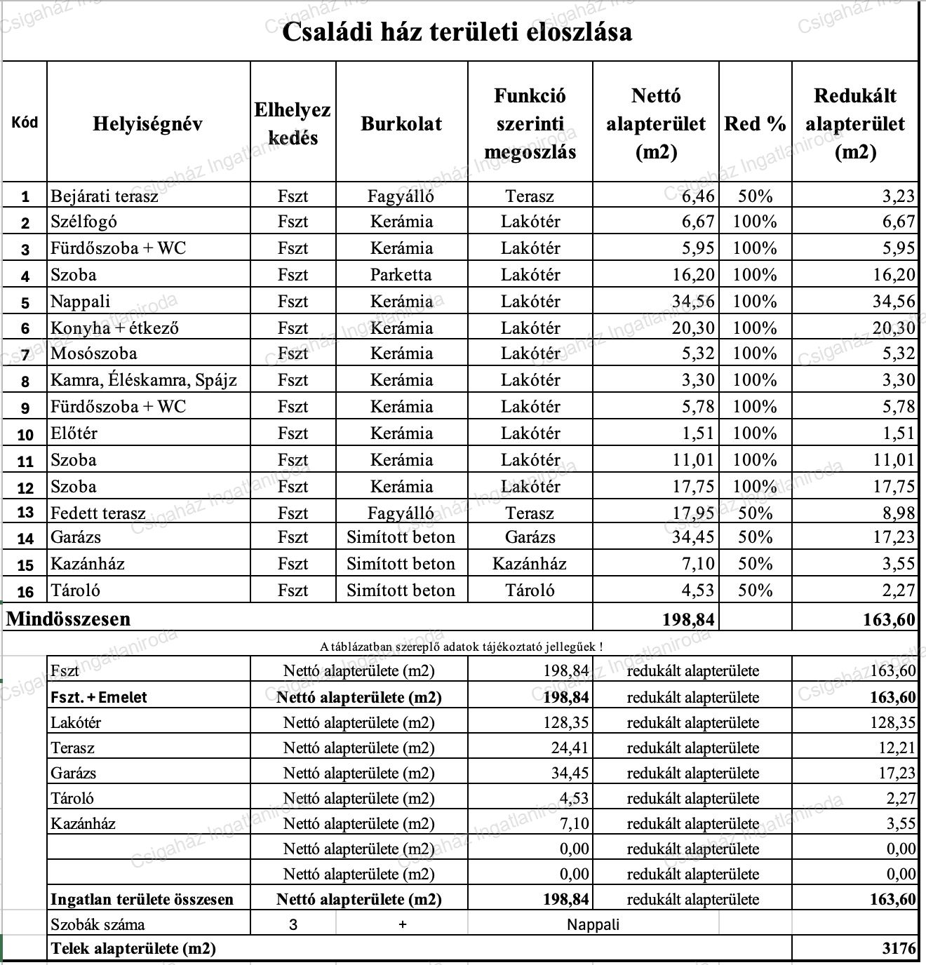 • Lakótér: Nettó alapterület 198,84 m² Redukált alapterület 163,60 m2 (lakótér: 128,35 m², garázs: 34,45 m²), jól átgondolt, világos, tágas elrendezés.
