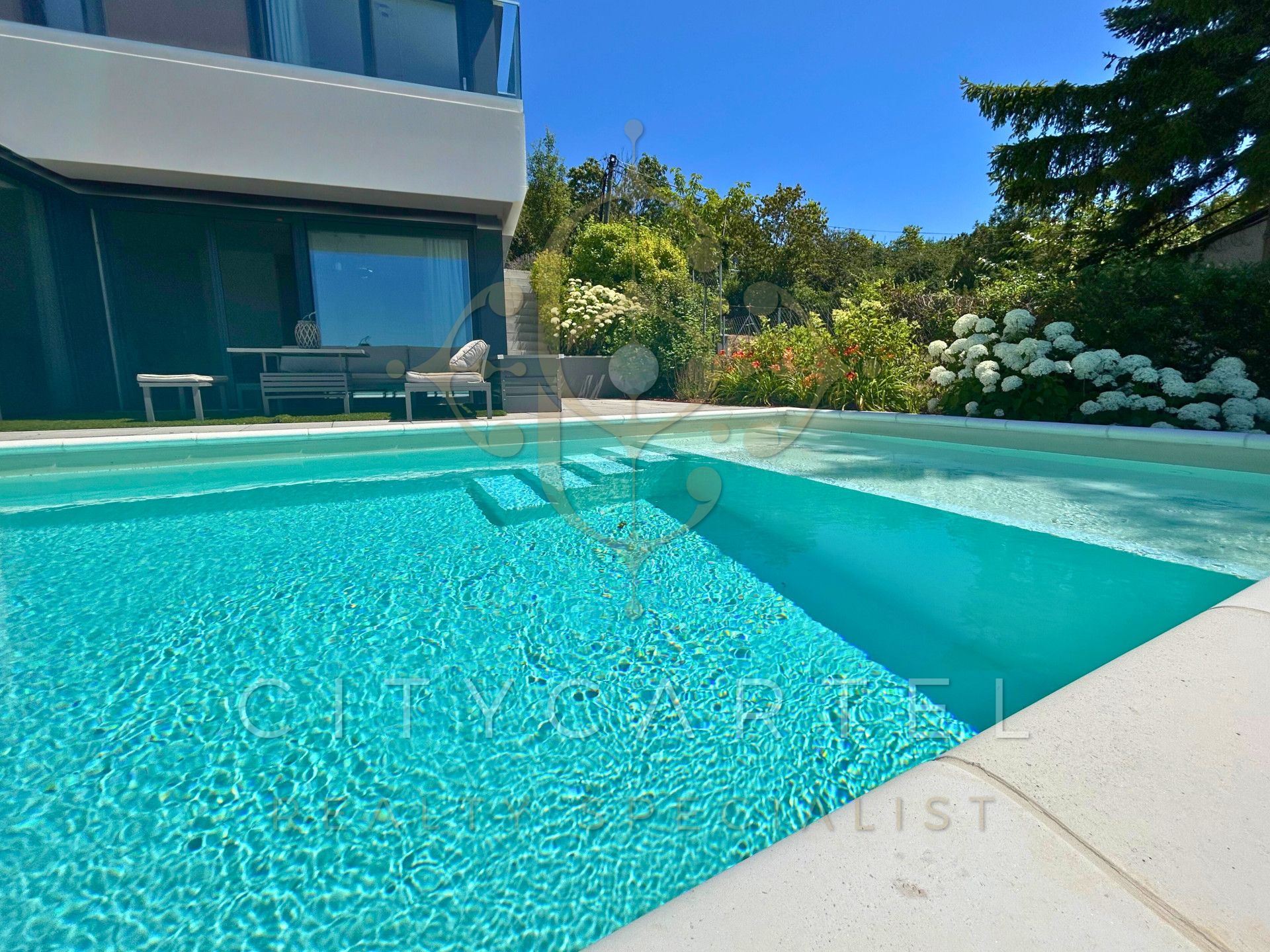 Nagy üvegfelületek, közvetlen kijárattal a teraszra és a kültéri medencéhez