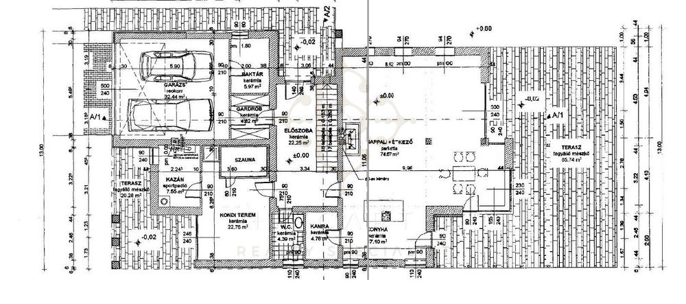 Fsz.: előtér, nappali- étkező, konyha, kamra, szauna, konditerem, gardrób, toalett, dupla garázs, tároló, kazánház, teraszok.