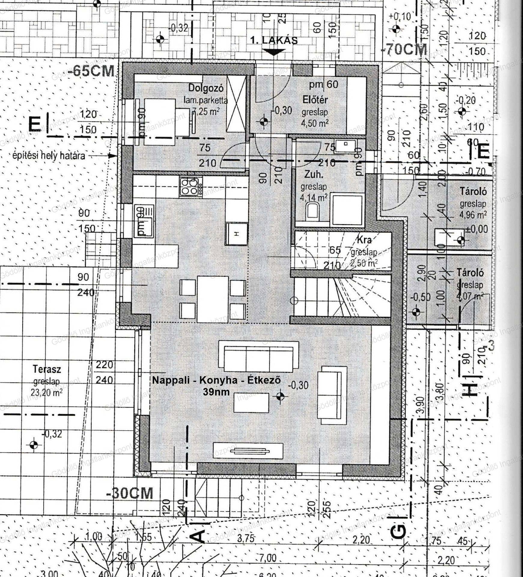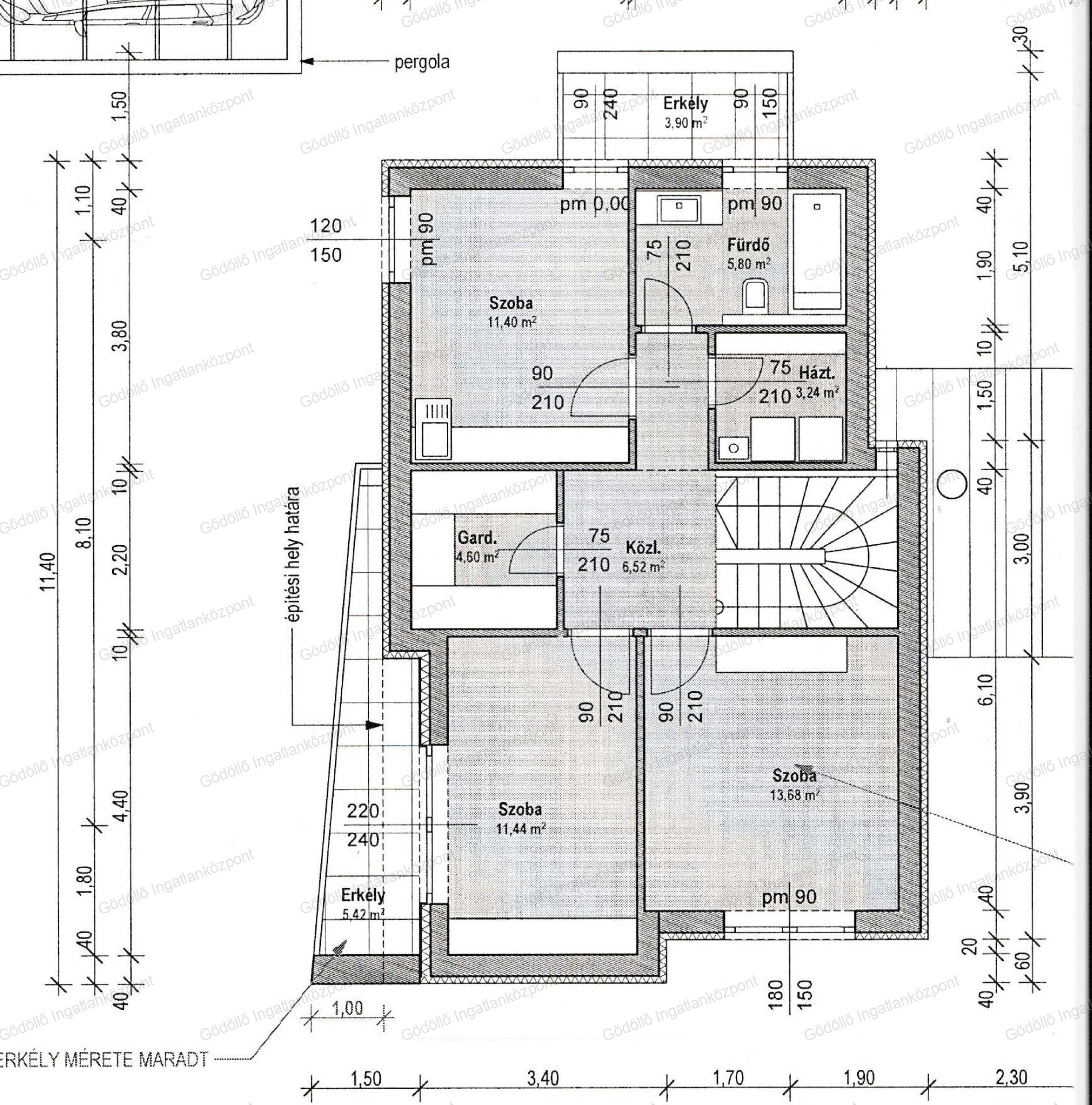 A nappaliból 23,2nm-es terasz, a két kisebb fenti szobából 5,42 és 3,9nm-es erkély nyílik.