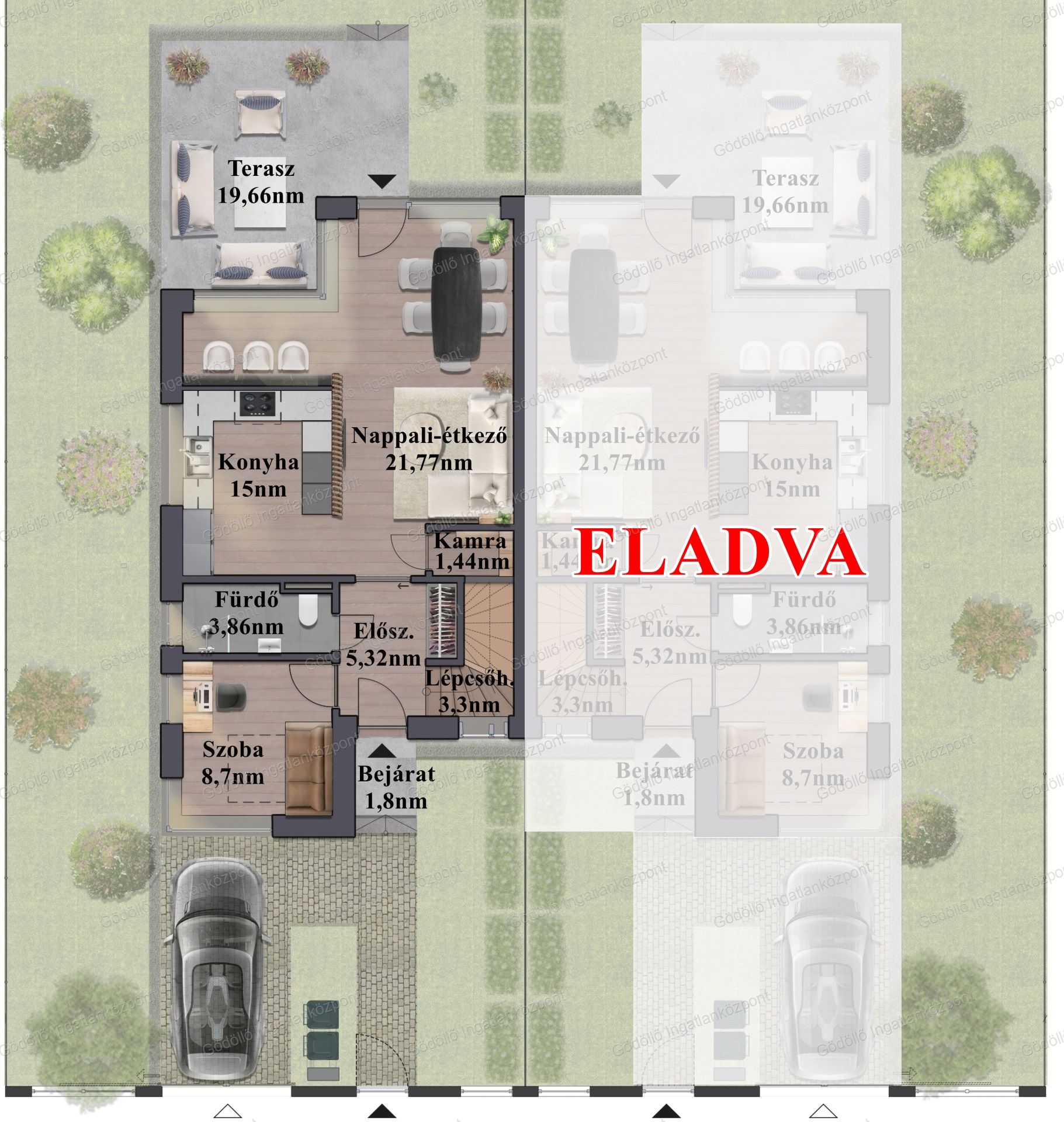 - Földszint (81nm) : előszoba, nappali-konyha-étkező, kamra, szoba, fürdő, 19,66nm terasz.