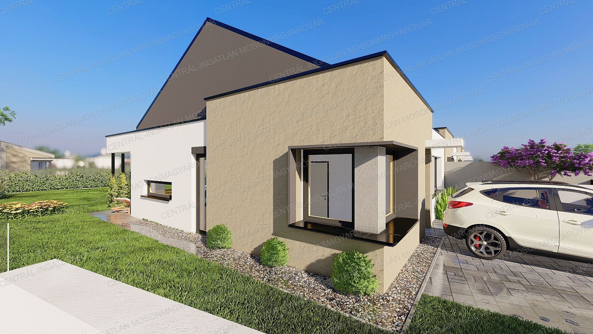 -A ház formája modern, letisztult stílusú tervezés eredménye. A belső elosztás is rendkívül ideális. A földszintes házban megtalálható a nappali-étkező-konyha mellett, három hálószoba, továbbá fürdő wc-vel, egy önálló wc, háztartási helyiség, közlekedő és egy tágas előszoba is.