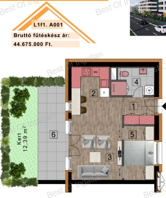 A hirdetésben szereplő L1. típusú, földszinti lakás 38,30 m2 + 11,15 m2 terasszal, 12,39 m2-es kizárólagos használatú zöld területtel.