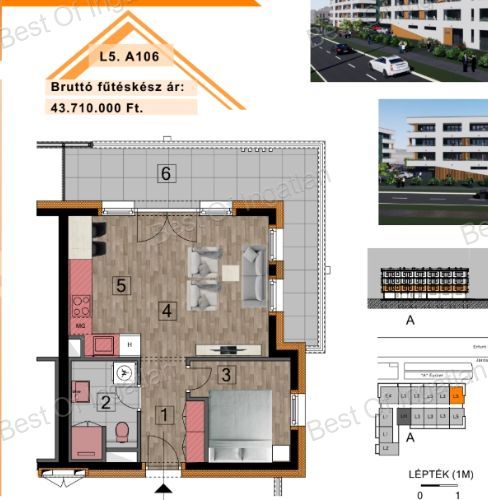 A hirdetésben szereplő L5. típusú, első emeleti lakás 36,67 m2 + 14,08 m2 erkéllyel.