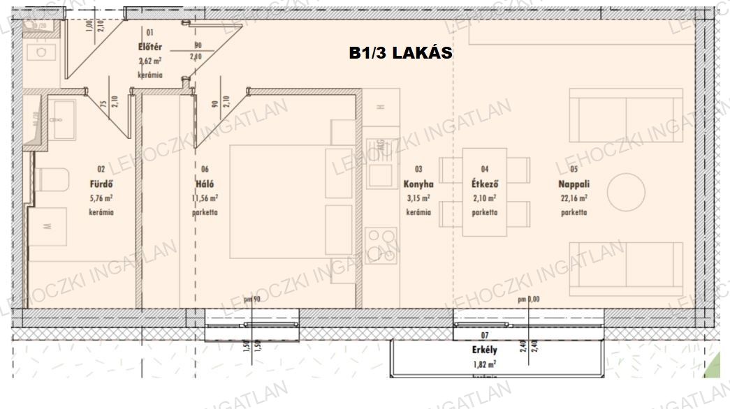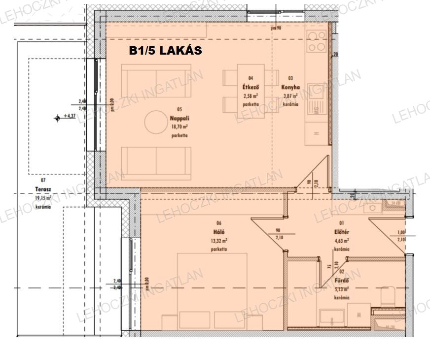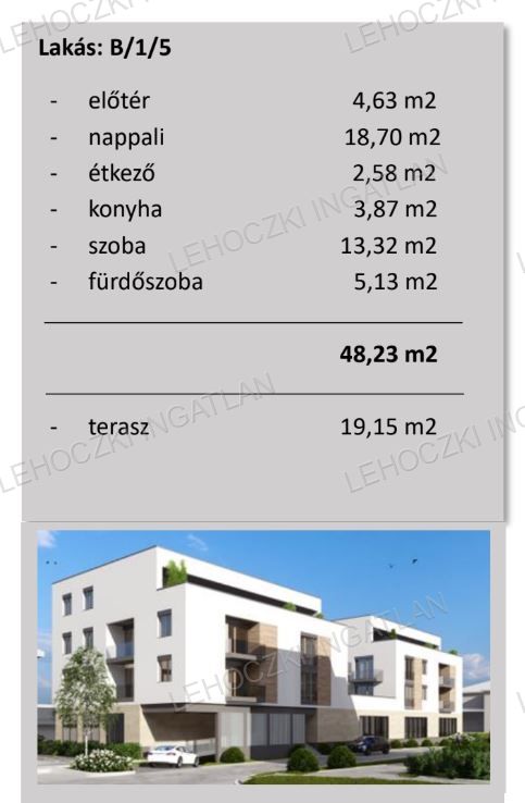 B.1.5 lakás 48.23 nm-es, amelyhez tartozik egy 19,15 nm-es terasz. 58.380.000,-Ft