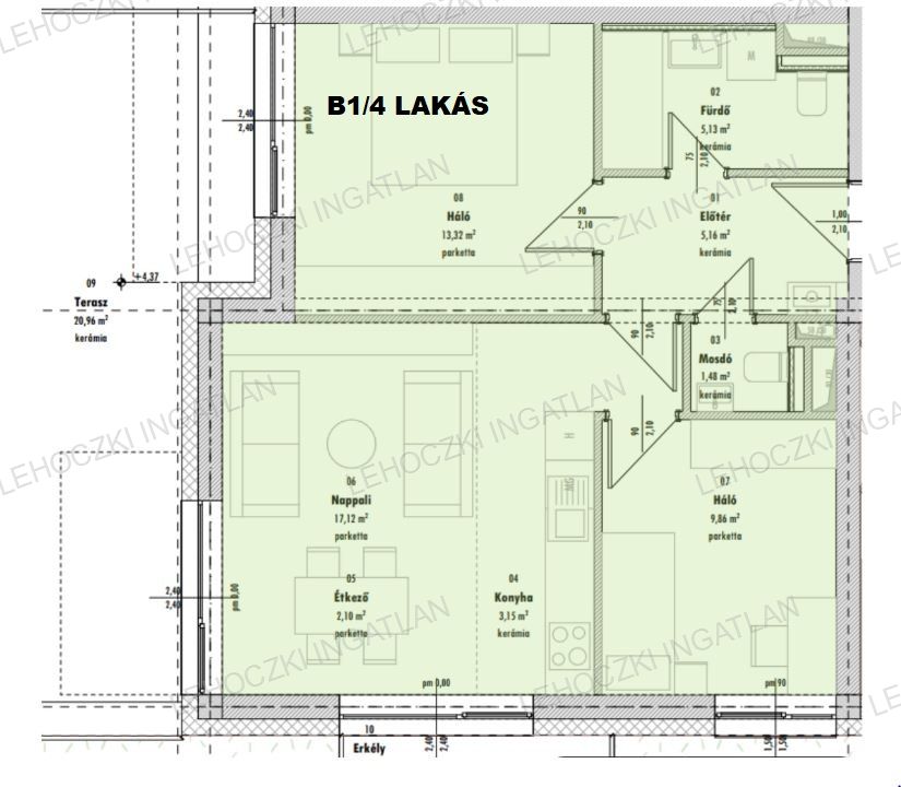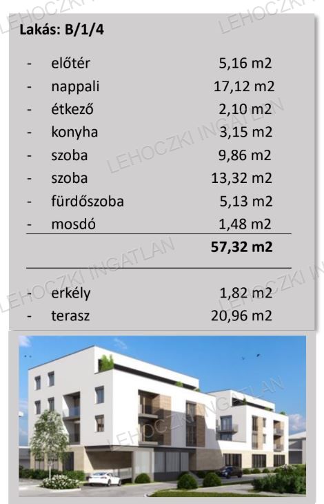 B.1.4 lakás 57,32 nm-es, amelyhez tartozik egy 20,96 nm-es terasz és egy 1.82 nm-es erkély. 69.400.000,-Ft