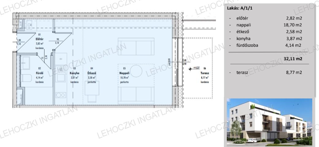 A.1.1 lakás 32,11 nm-es, amelyhez tartozik egy 8,77 nm-es terasz. 40.900.000,-Ft