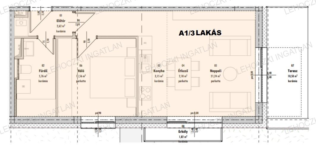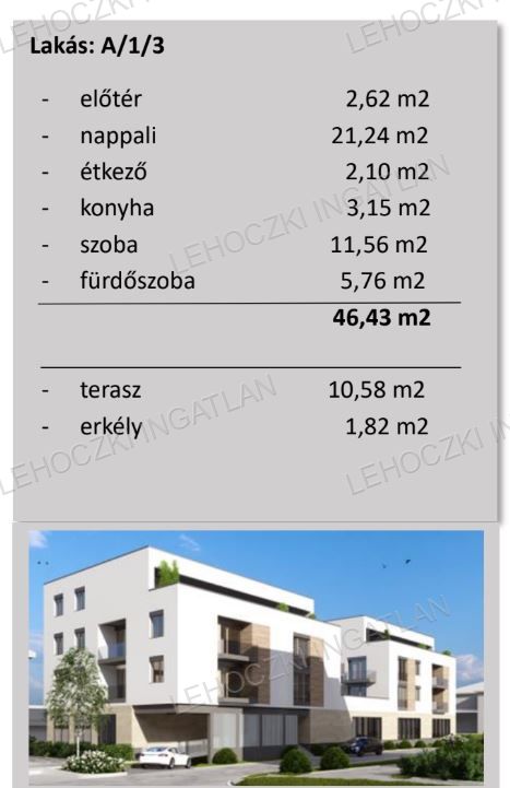 A.1.3 lakás 46,43 nm-es, amelyhez tartozik egy 10,58 nm-es terasz és egy 1,82 nm-es erkély. 53.160.000,-Ft