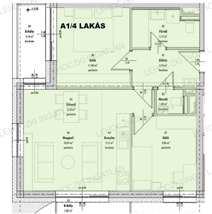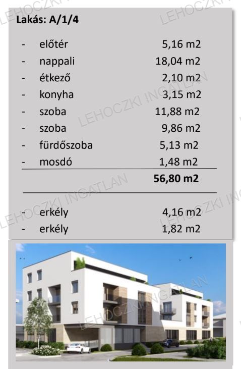 A.1.4 lakás 56,80 nm-es, amelyhez tartozik egy 4,16 nm-es és egy 1,82 nm-es erkély. 60.390.000,-Ft