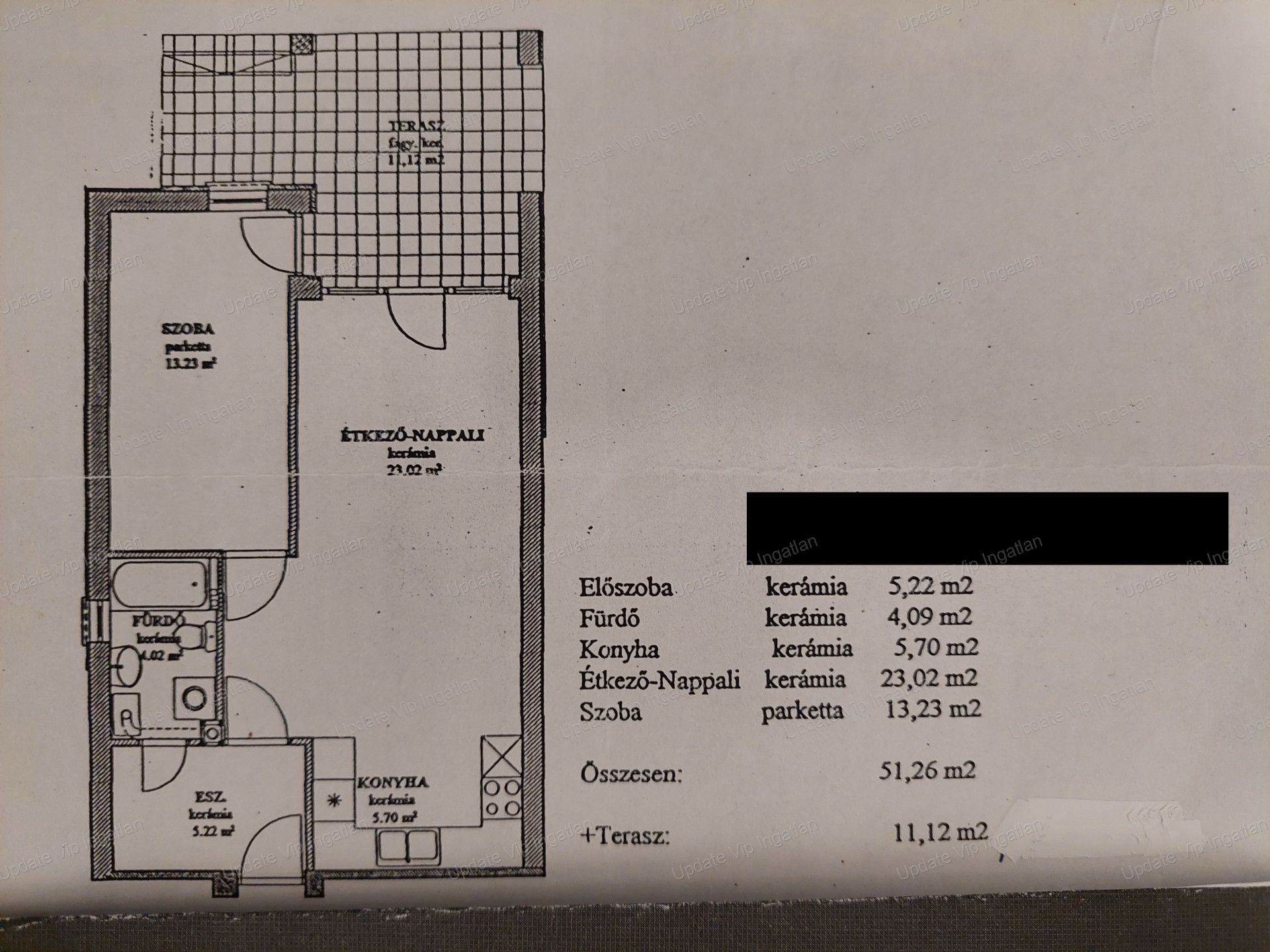 Elrendezés: előszoba, nappali–étkező–konyha, hálószoba, kádas fürdőszoba WC-vel, terasz