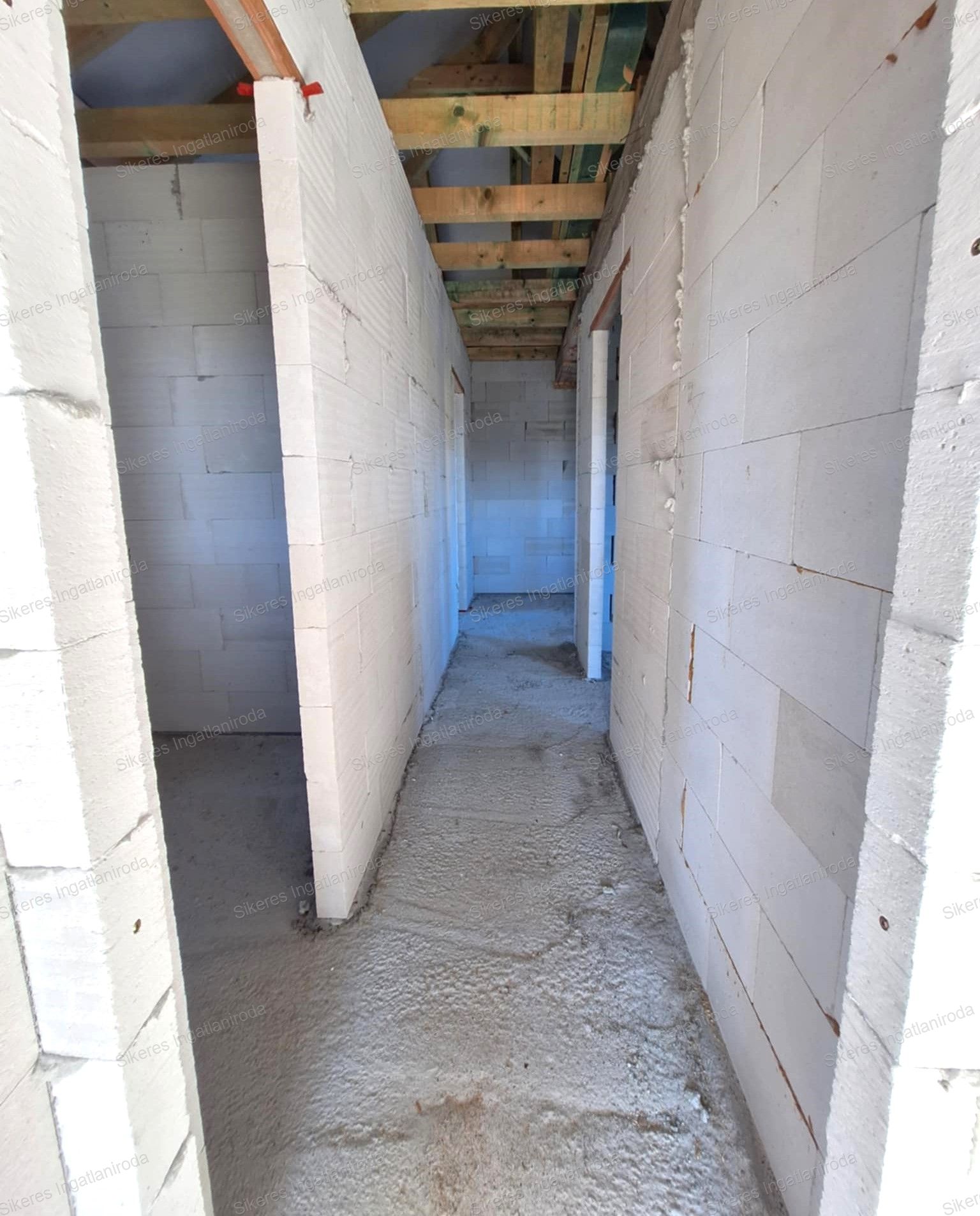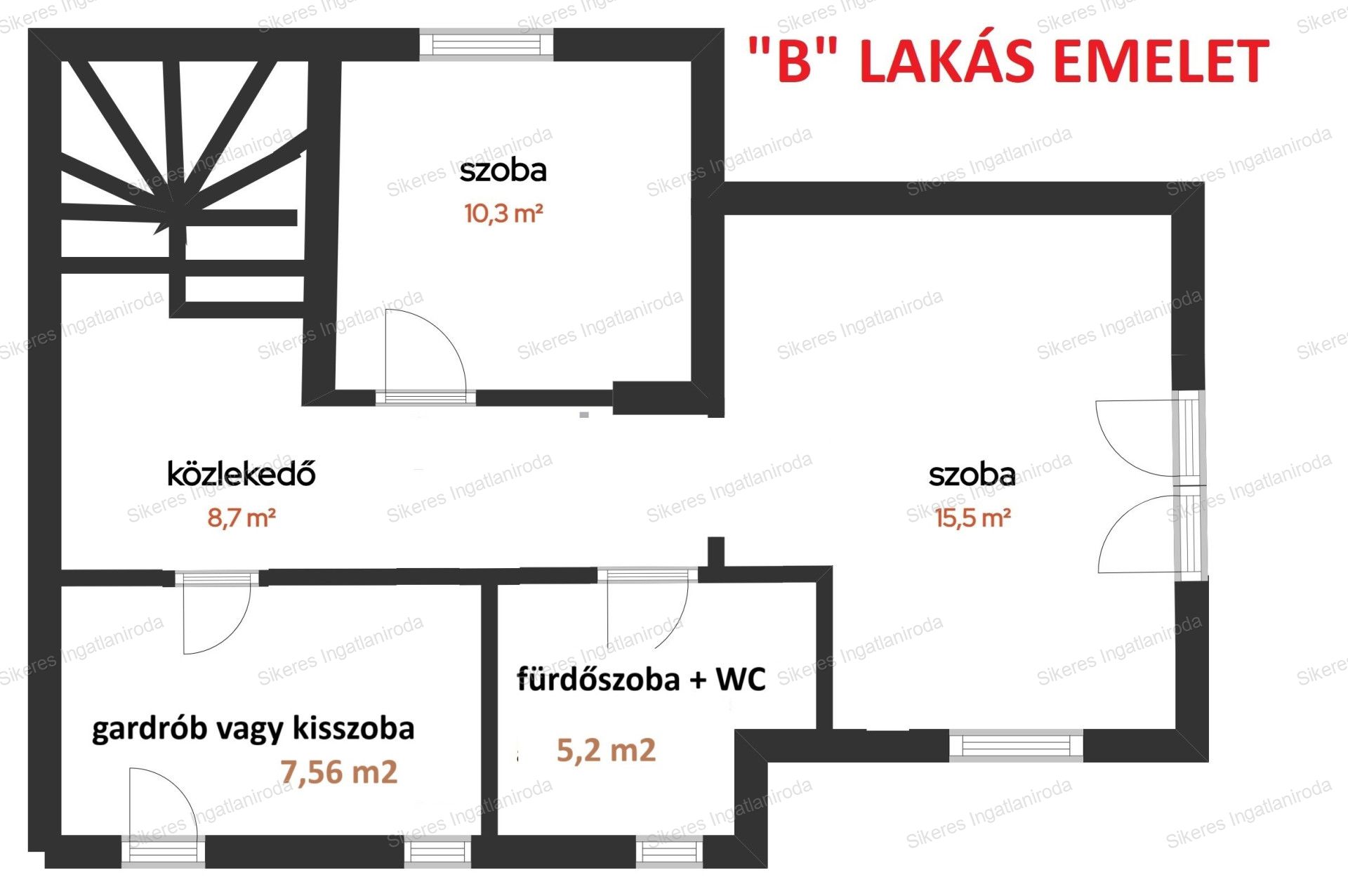 Az emeleti szinten egy hosszú, 8,7 m²-es közlekedőből nyílik minden helyiség: két különálló hálószoba (10,3 m² és 7,56 m²), egy tágas 15,5 m²-es fő hálószoba, valamint egy fürdőszoba WC-vel (5,2 m²). Az emeletről egy francia kilépő is elérhető, amely a kert zöldjére néz, csendes, pihenésre alkalmas hangulatot teremtve. A praktikus elrendezésnek köszönhetően a lakás kiválóan alkalmas gyermekes családok számára, de elhelyezkedése és kialakítása miatt befektetési célra is remek választás.