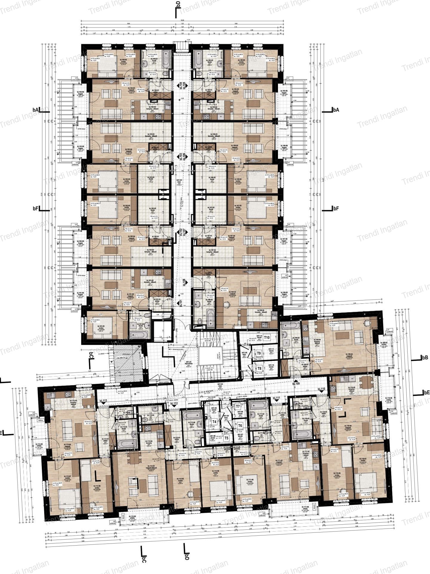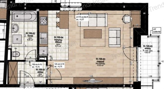 A meghirdetett 1. emeleten található 42,91 nm-es lakásban amerikai konyhás nappali, fürdőszoba, előtér található. A nappaliból 4,82 nm-es erkély nyílik.