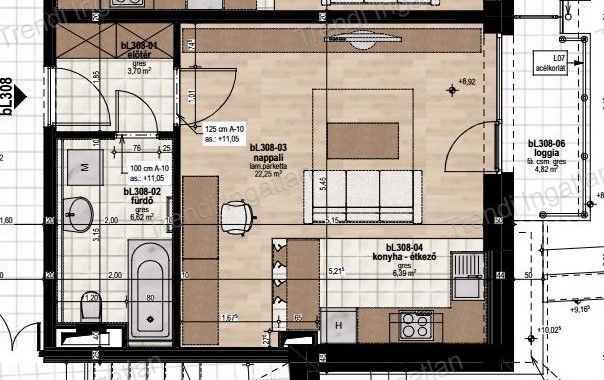 A meghirdetett 3. emeleten található 38,96 nm-es lakásban amerikai konyhás nappali, fürdőszoba, előtér található. A nappaliból 4,82 nm-es loggia nyílik.