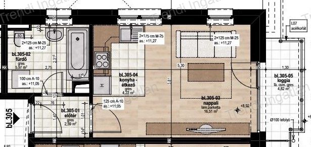 A meghirdetett 3. emeleten található 29,29 nm-es lakásban amerikai konyhás nappali, fürdőszoba, előtér található. A nappaliból 4,82 nm-es loggia nyílik.