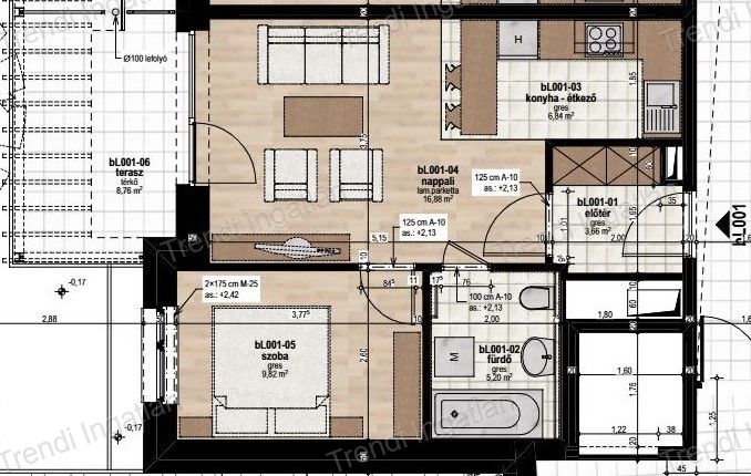 A meghirdetett földszinten található 42,40 nm-es lakásban amerikai konyhás nappali, szoba, fürdőszoba, előtér található. A nappaliból 8,76 nm-es terasz nyílik. A földszinti lakásokhoz kertrész tartozik.